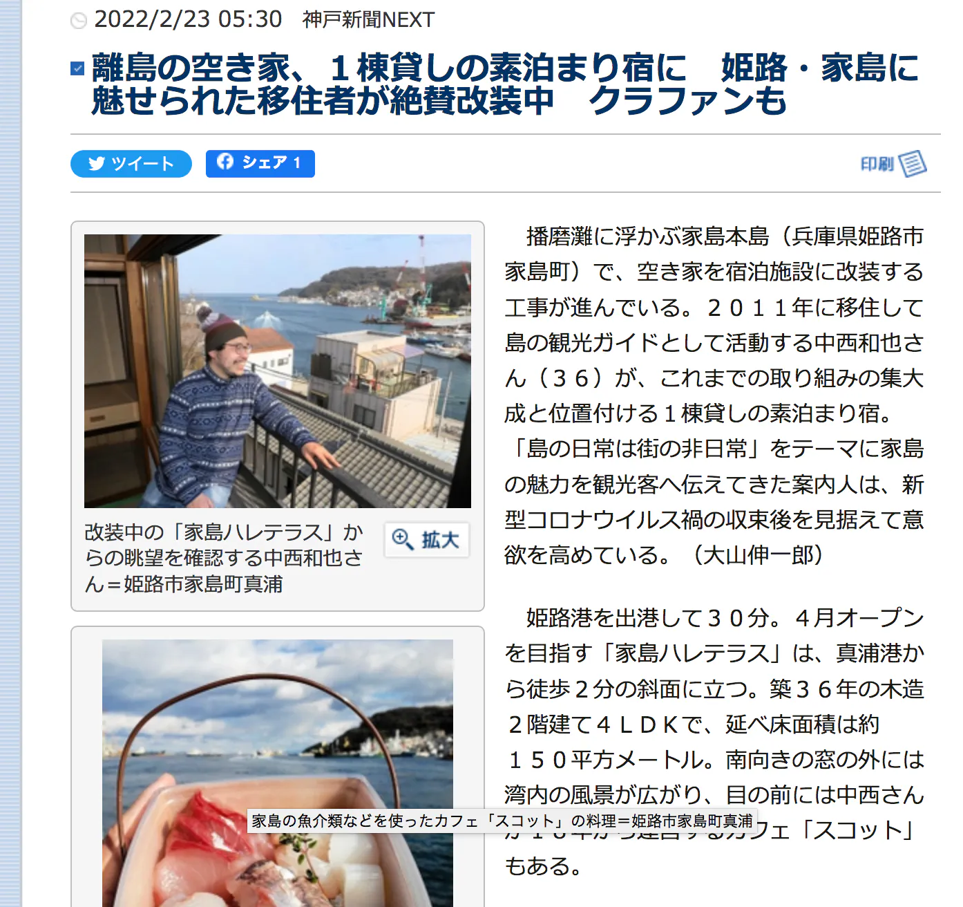 2022/02/23 16:00多謝!!2月1日から実施したこのチャレンジですが、多くの皆様からのご支援・ご協力により、チャレンジ期間を残して目標100%を達成することができました!本当にありがとうございました!!!チャレンジ期間は僕の誕生日である今月末までなんですがこれは、この日までに目標金額に到達していなかったら『誕生日なんでなんとかご協力ください〜』とみなさんに泣きつこうとと思っていました。。でもその必要がなく、また、こんな狡い僕を応援していただいた皆様には本当に感謝しかありません。*ご支援いただいた皆様には、チャレンジ期間終了後にメッセージにてリターン詳細について調整させてください!お待たせして申し訳ありません。チャレンジ終了まであと6日!たぶん最初で最期のクラファン挑戦!!この機会に、少しでも家島の魅力を知っていただけるようにもう少し頑張ります!!!また、先日ご紹介いたしました神戸新聞の記事がupされています。ご高覧ください。「離島の空き家、1棟貸しの素泊まり宿に 姫路・家島に魅せられた移住者が絶賛改装中 クラファンも」↓https://www.kobe-np.co.jp/news/himeji/202202/0015084976.shtml もっと見る