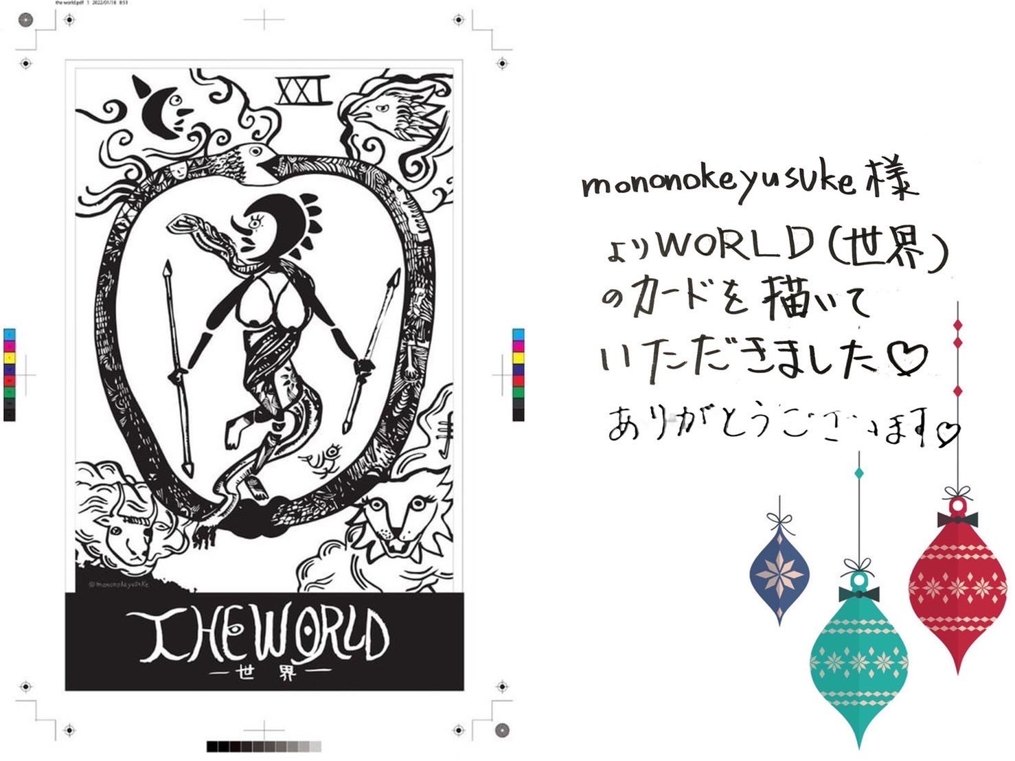 そして、ゆうすけさんのニューアルバム「予祝」に「世界へ」というすてきな曲と今回描いていただいた21番「世界」のカードと偶然にもぴったり重なった感じでした!