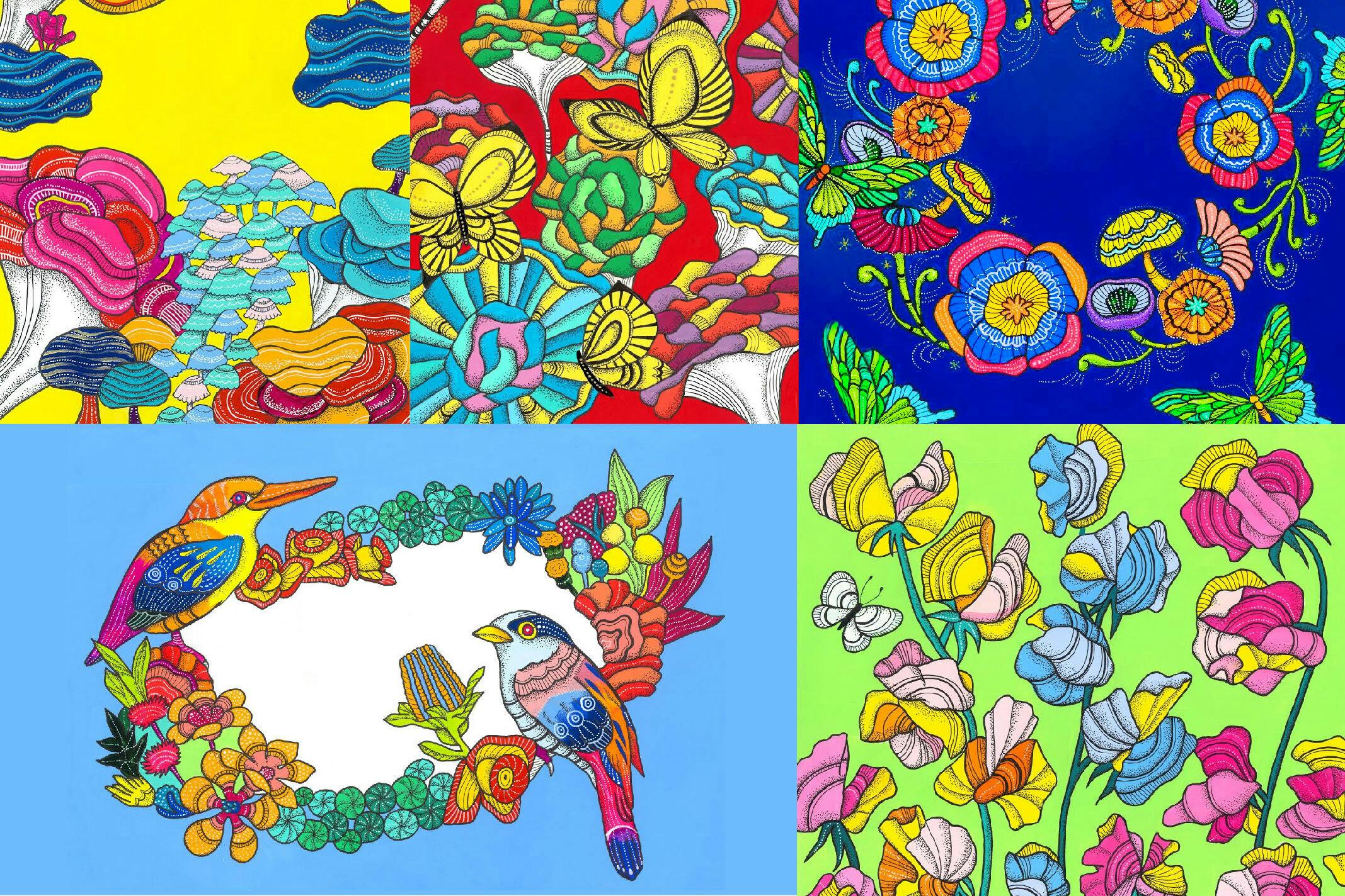 自然のモチーフをアクリルガッシュでビビッドに描いておりました。