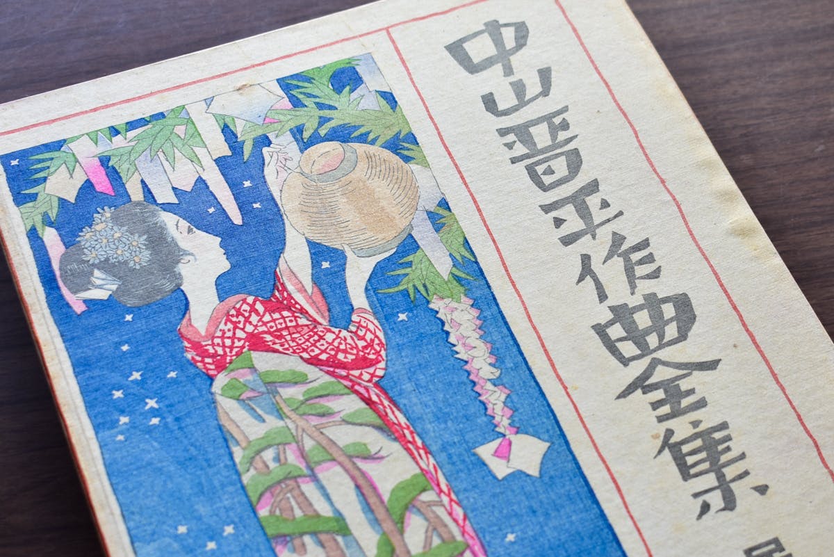 さらに、上記の日本酒2種を収める化粧箱を制作します。箱の表紙には、晋平が生前に300部のみ発行した木版本「中山晋平作曲全集」の装幀画を使用します。大正の浮世絵師と呼ばれた竹久夢二を象徴するような美人画です。