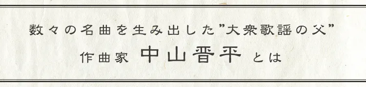 1887年(明治20年)長野県下高井郡新野村(現・中野市)に生まれた中山晋平は、現代歌謡の礎を築いたとされる多くの傑作を生み出した、日本を代表する作曲家です。
