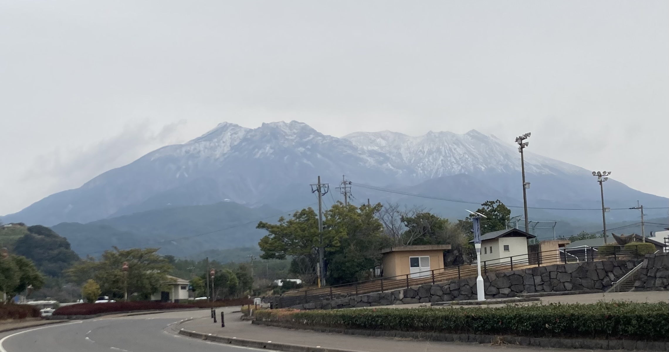 桜島、めっちゃ寒いです!!!!山頂の白いの雪ですわー。