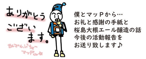 2022/04/07 21:20皆さま、おやっとさぁです。また飲みたい!!支援しとけば良かった〜!な方に朗報です。鹿児島市では、騎射場 ペンギン酒店さん大阪では、箕面小野原西 MiRoKuさんにて提供中です!本数限定なので、必ず飲みたい方はTELご予約確認&ご予約必須!?ペンギン酒店さんでは、「お刺身えびの黄身醤油ごはん」か「ずるいソーセージ」で合わせてもらいたい(笑)他ももちろんオススメです♪MiRoKuさんでは、焼鳥もとても相性良しですが「イチボのローストビーフ」か「特大海老フライ自家製タルタルソース」でグビっといってもらいたい!そして、タップから注がれるのが飲めちゃうのが大阪・阿倍野 レゼットさん。こちらはタップの順番待ちの為、提供開始はしばらくお待ち下さいー。僕のTwitterにて、お知らせ出来ればと思っております。最後に…桜島大根エール、第二弾が造れるかどうかはまずは桜島大根を育てるかどうか?出来れば自分の醸造所を造ってそこで造りたいが、資金不足中。ともかく、また飲んで頂けるように画策中で御座います!そのときは、本プロジェクトにご支援して頂いた皆様にはご一報入れさせて頂きますね。美味しかった!のその一声がとても響きました!!挫けずプロジェクトをやり遂げて良かった…桜島大根とクラフトビールの美味しさをちゃんとお伝えすることが出来て本当に良かったです。櫻島色刷染も少しづつ知って頂けたり。ありがとうの言葉だけでは足りない。皆さまにまたお届けできるように繋げたい。でも言わせてください。ご支援頂いた皆さま、松尾さん、センターポイントスタッフの皆、TAMAYURANのあきえさん、桜島ミュージアムの皆さん、色んな方々に感謝しています。本プロジェクトに関わって頂き、ありがとうございました。一旦は締めくくりますが、桜島でのクラフトビール関連はこれからなので、また皆さまに良いご報告が入れれるように進んでいきます。 2022.4.7桜島の自宅にて てんちょう伊東---------------ほんじつのマッPのタキギにっき。---------------みなさまっ、こんばんはっ。ついにさいしゅー回っ…ちょとさみしいなーっ。このあいだねっ、オオきくなってサクラジマを走ったんだよっ!すごいでしょっ?えへへっ♪走ったアトってグビってのみたくなっちゃうけどっ…でこんエールのみたかったけどっ、ツカれてねちゃったよっ☆またねっ! もっと見る