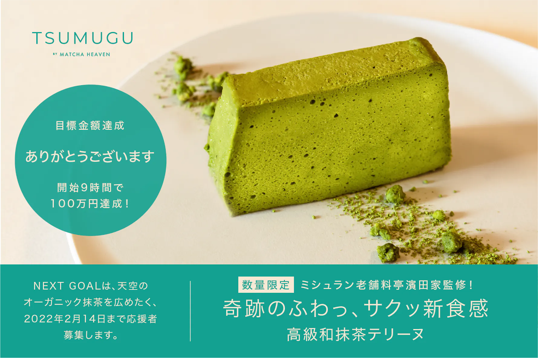 皆様、この度はキャンプファイヤーにて実施しているプロジェクト(ミシュラン老舗料亭濱田家監修!〝高級和抹茶テリーヌ“【ちょっと贅沢なお取り寄せ】)に多大なるご支援頂き、誠にありがとうございました。
