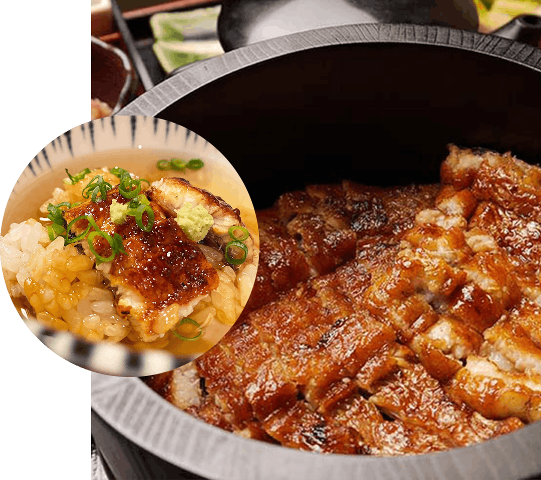 浅葱・紫蘇・山葵・胡麻・海苔・山椒・柚子などの七つの薬味を使った櫃まぶしを当店では、ななまぶしと呼んでおります。最初はそのまま鰻ご飯を!次は薬味を乗せて、最後は熱々のだし汁をかけてお召し上がりください。
