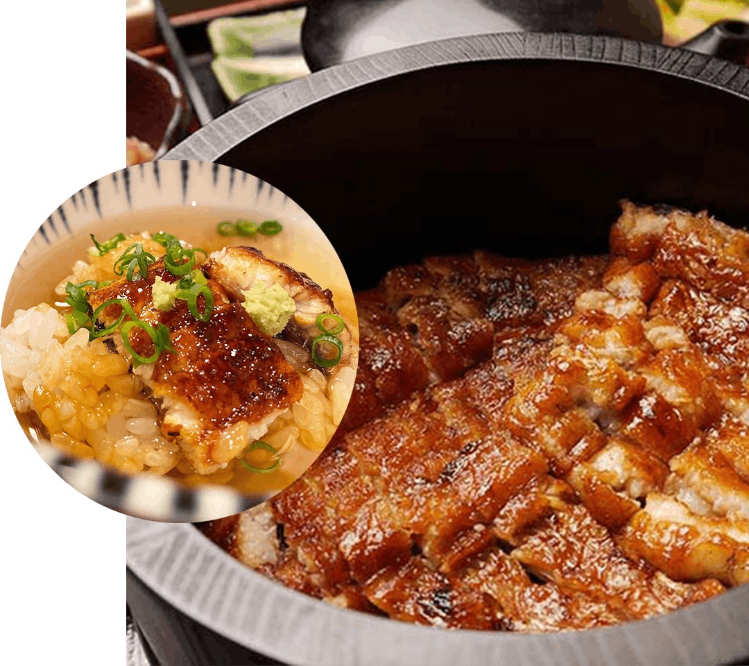 浅葱・紫蘇・山葵・胡麻・海苔・山椒・柚子などの七つの薬味を使った櫃まぶしを当店では、ななまぶしと呼んでおります。最初はそのまま鰻ご飯を!次は薬味を乗せて、最後は熱々のだし汁をかけてお召し上がりください。