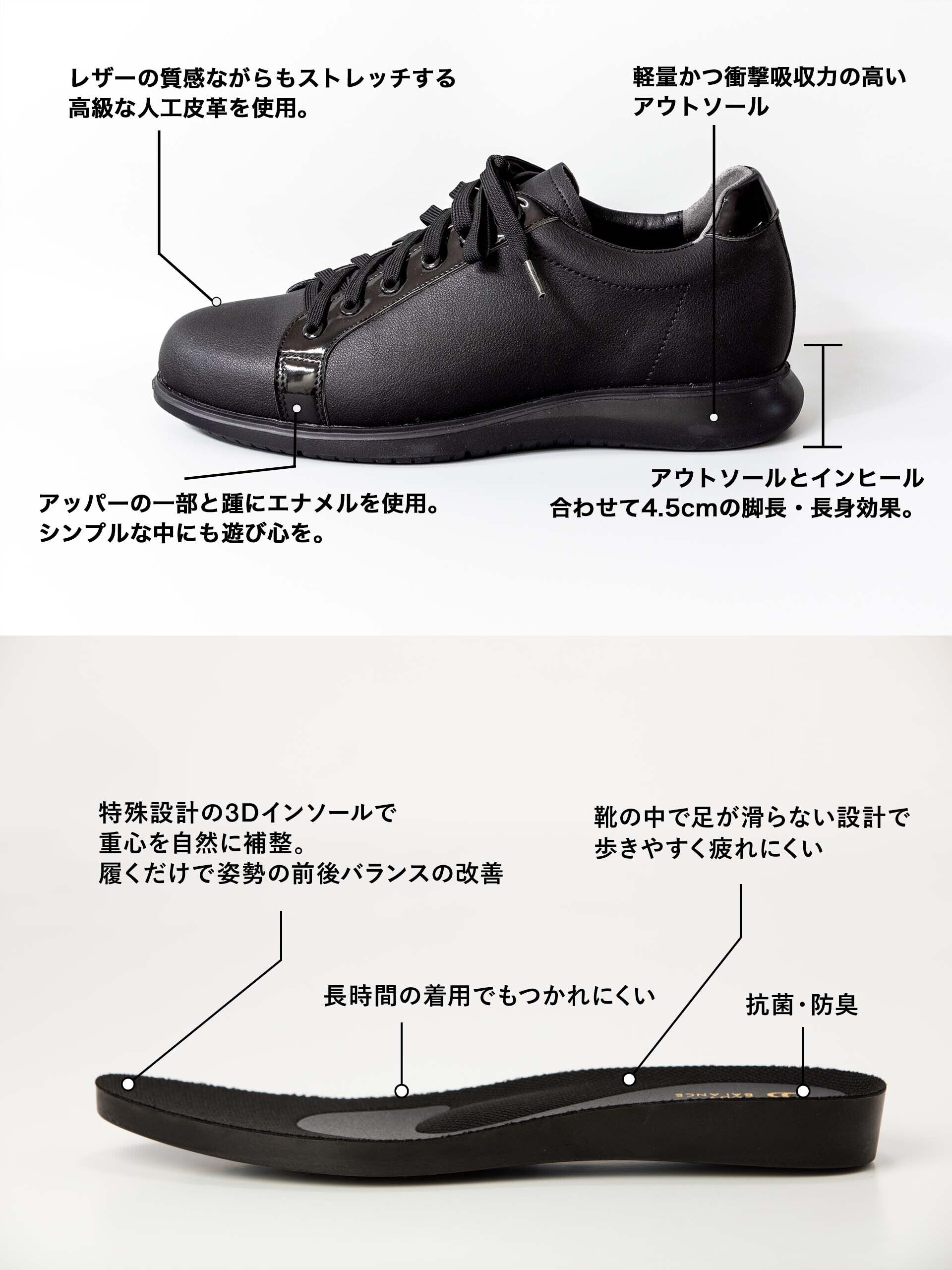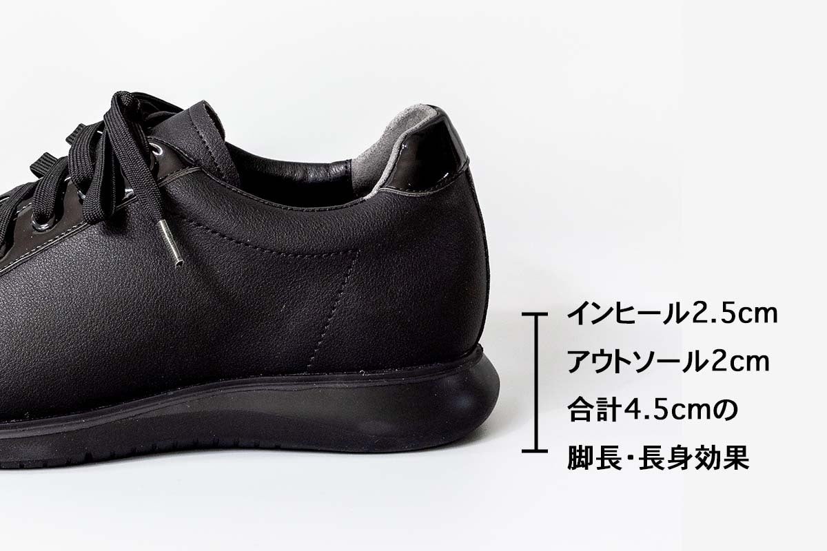 靴底2cmに加え、靴の中に2.5㎝のインヒールを仕込むことで、長身・脚長効果を得ることができます。