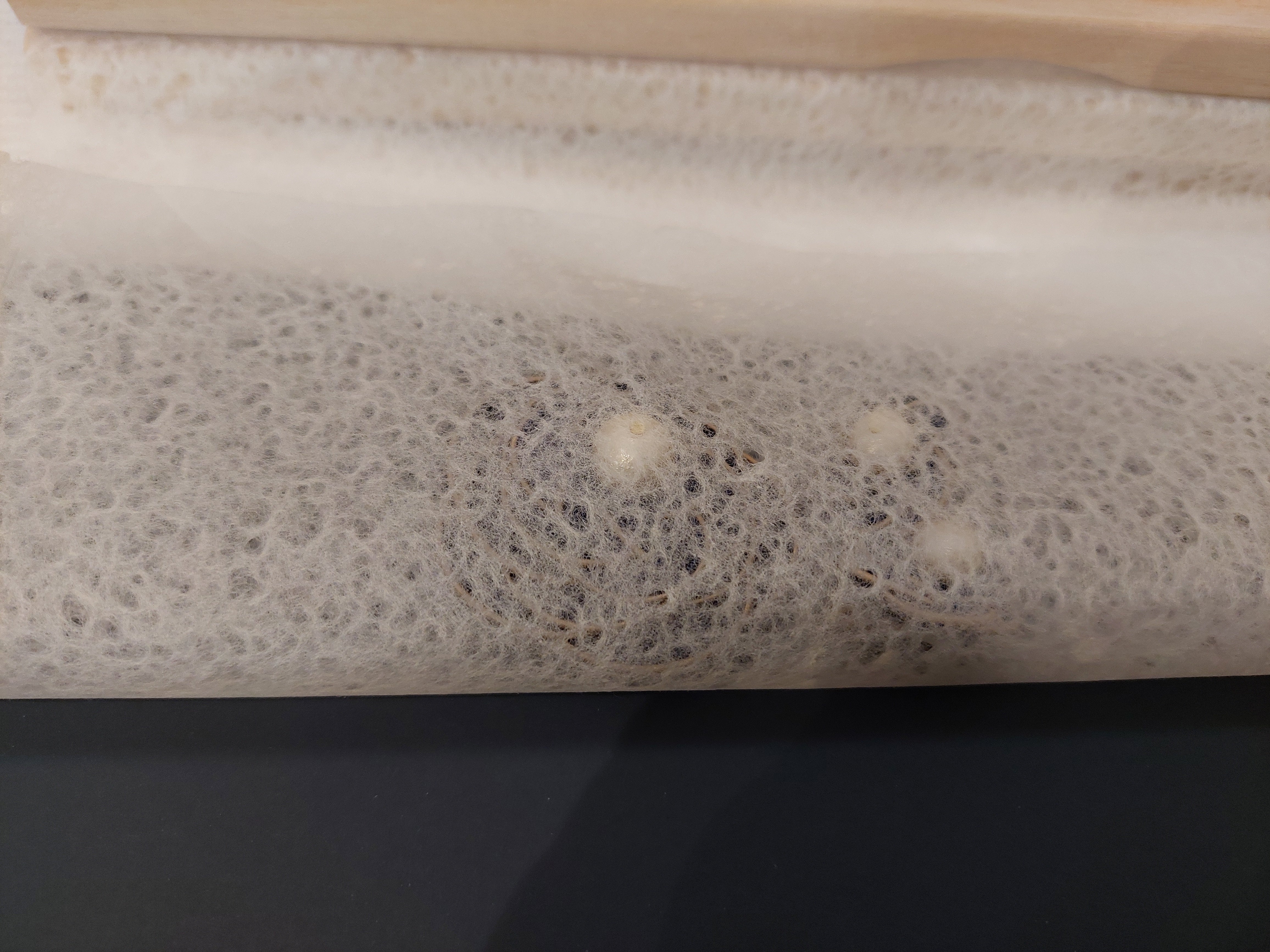 今回選んだ春雨紙は、機械抄きの為、シャワーによって水滴を落としたものです。