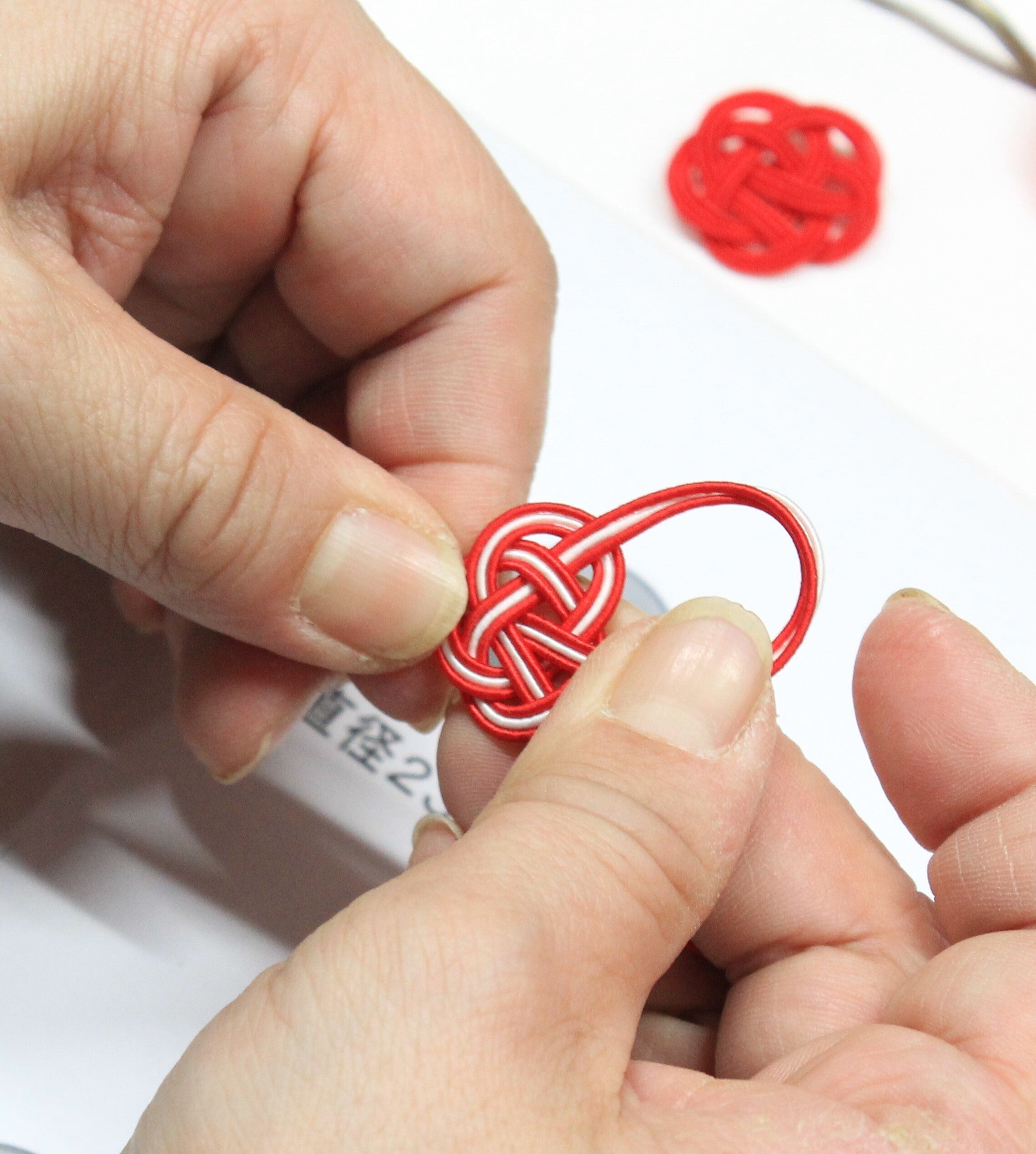 一つ一つ、水引の先端を揃え丁寧に結っていきます。結わなければ長く細い紐。