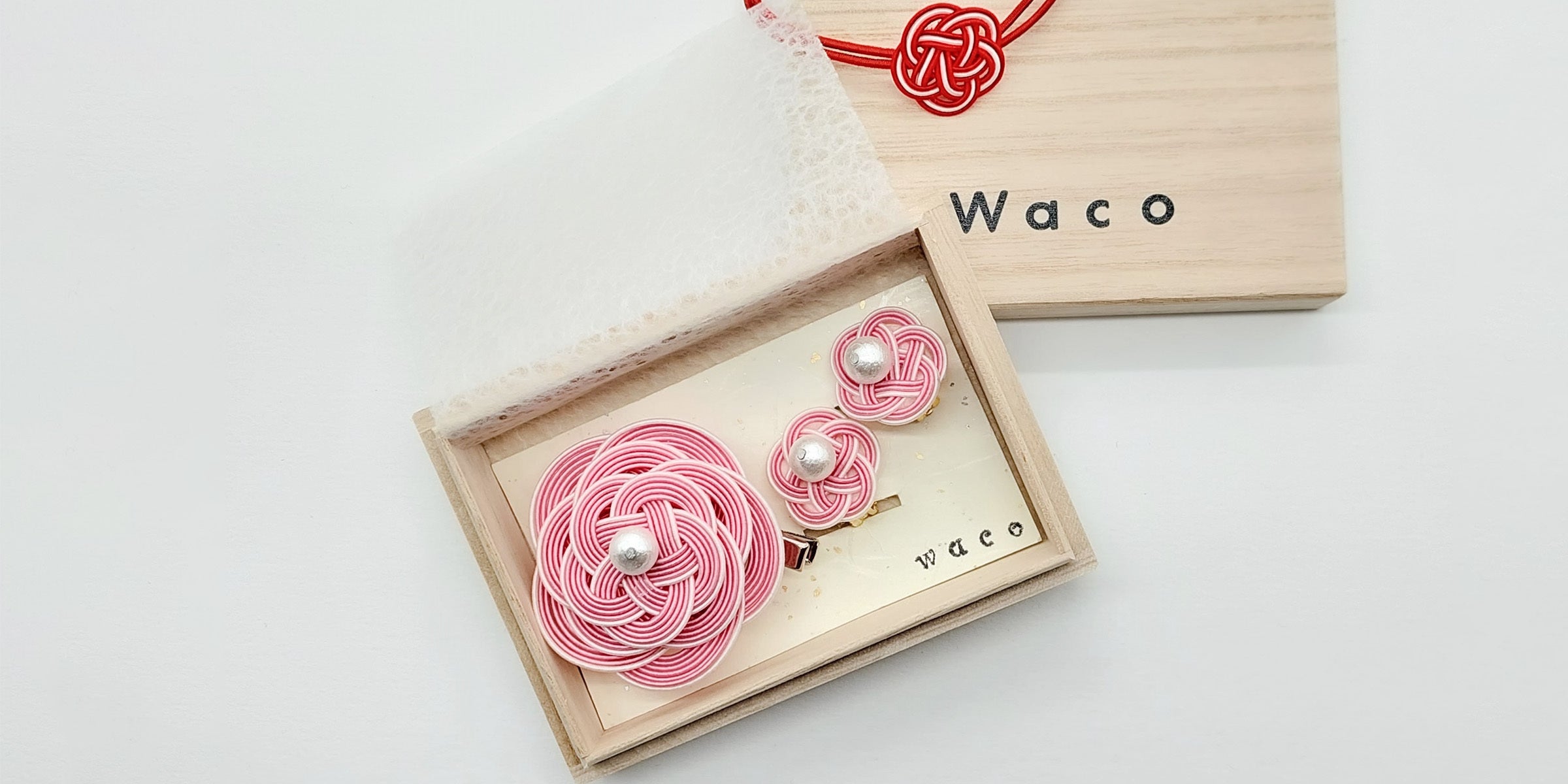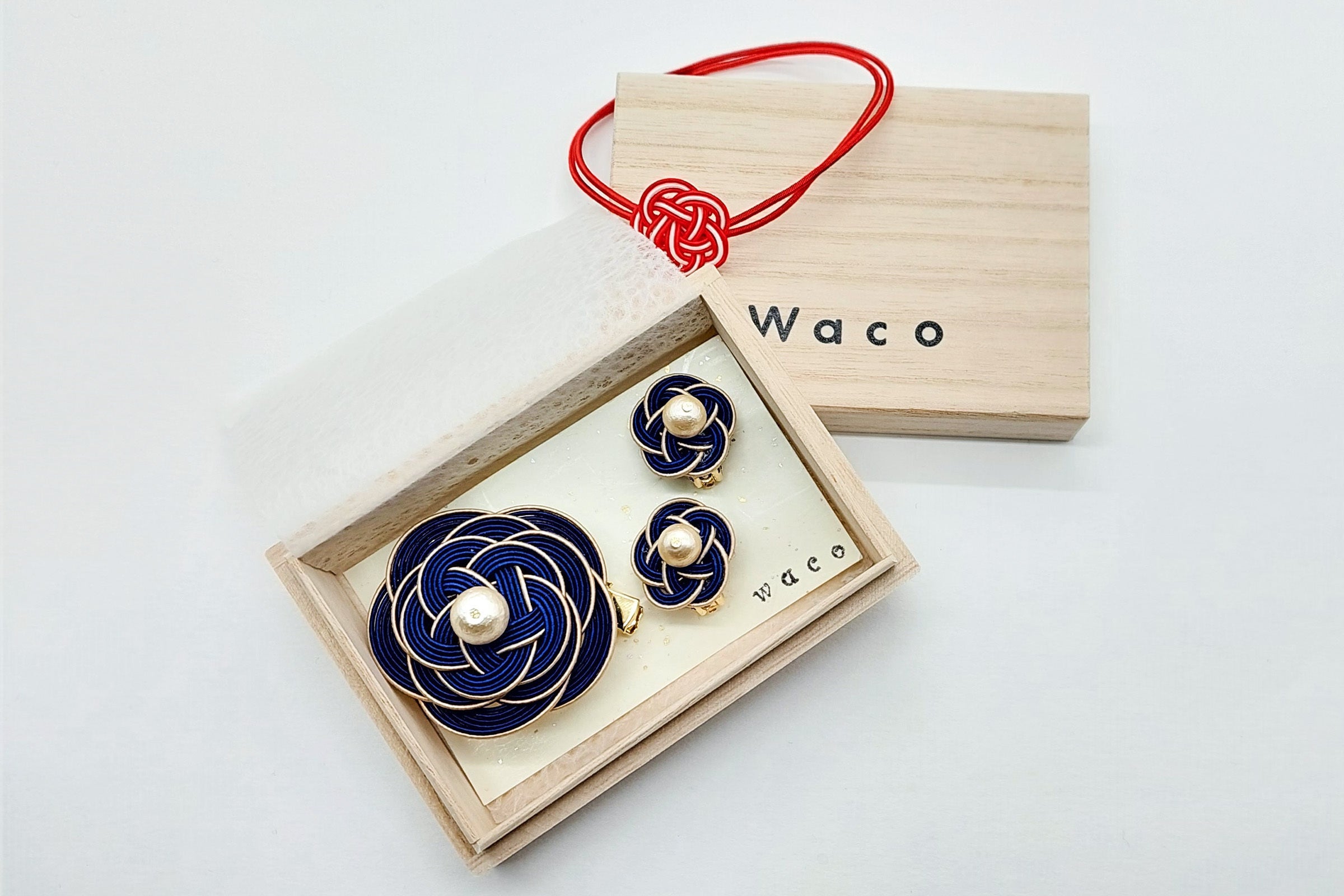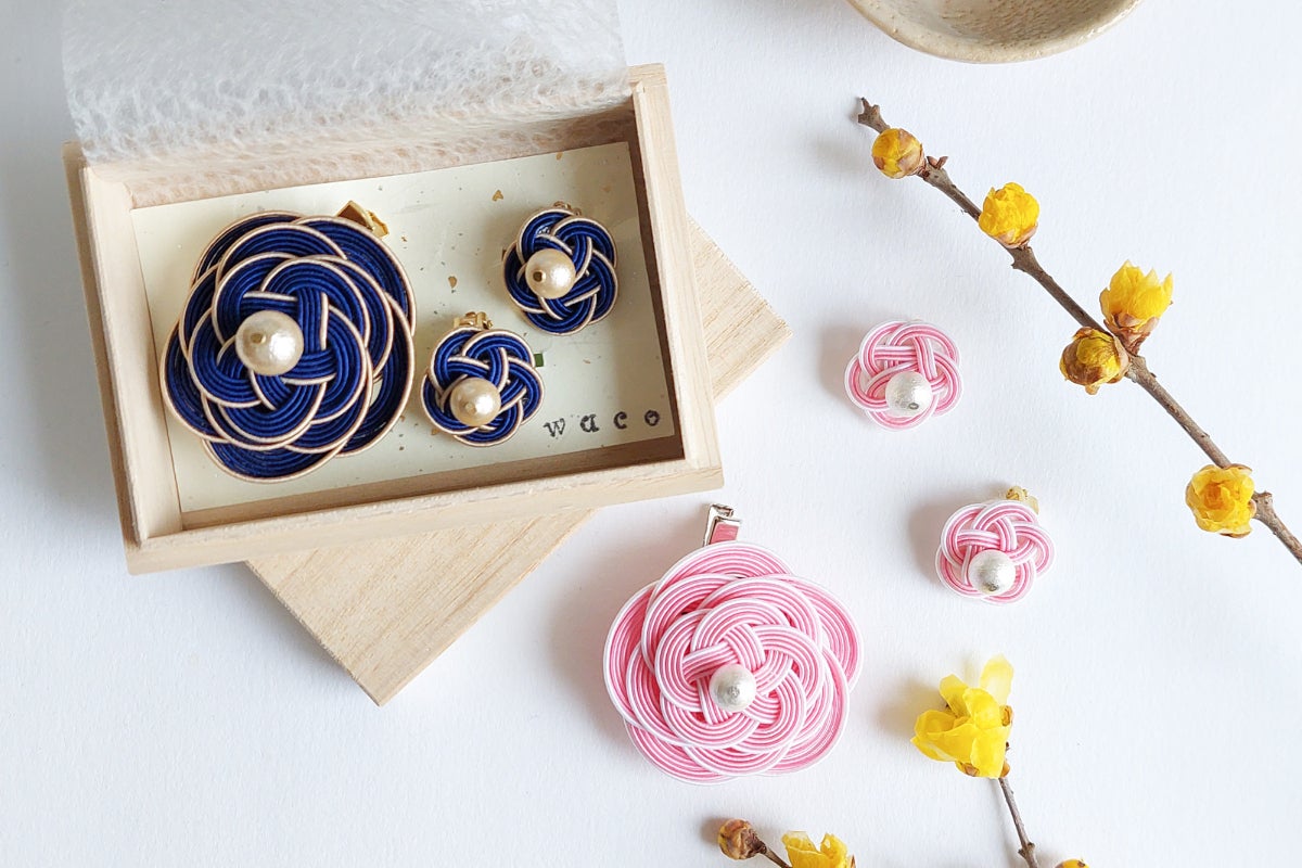 日本の伝統工芸『水引』を、コットンパールが可愛く上品に彩る ブローチとイアリングのアクセサリーセット!