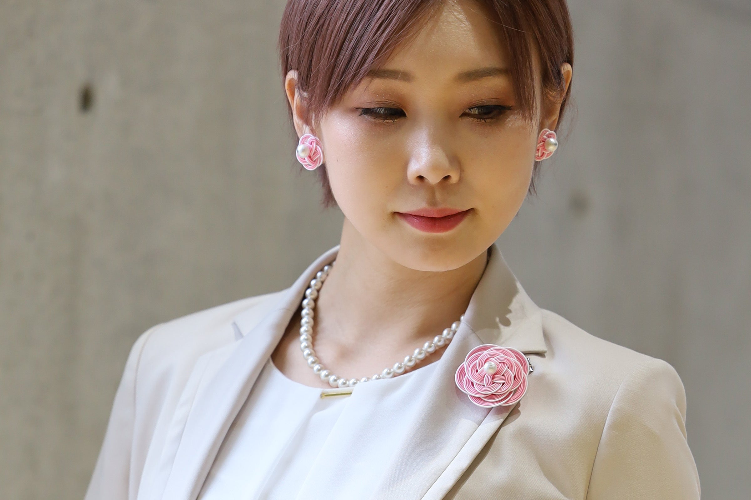ピンクのブローチ・イアリングセットは、パールネックレスと合わせることで普段のシンプルなスーツをフォーマルに変えてくれます。七五三、入学式、入園式などのお祝い事の場に彩ってくれます。