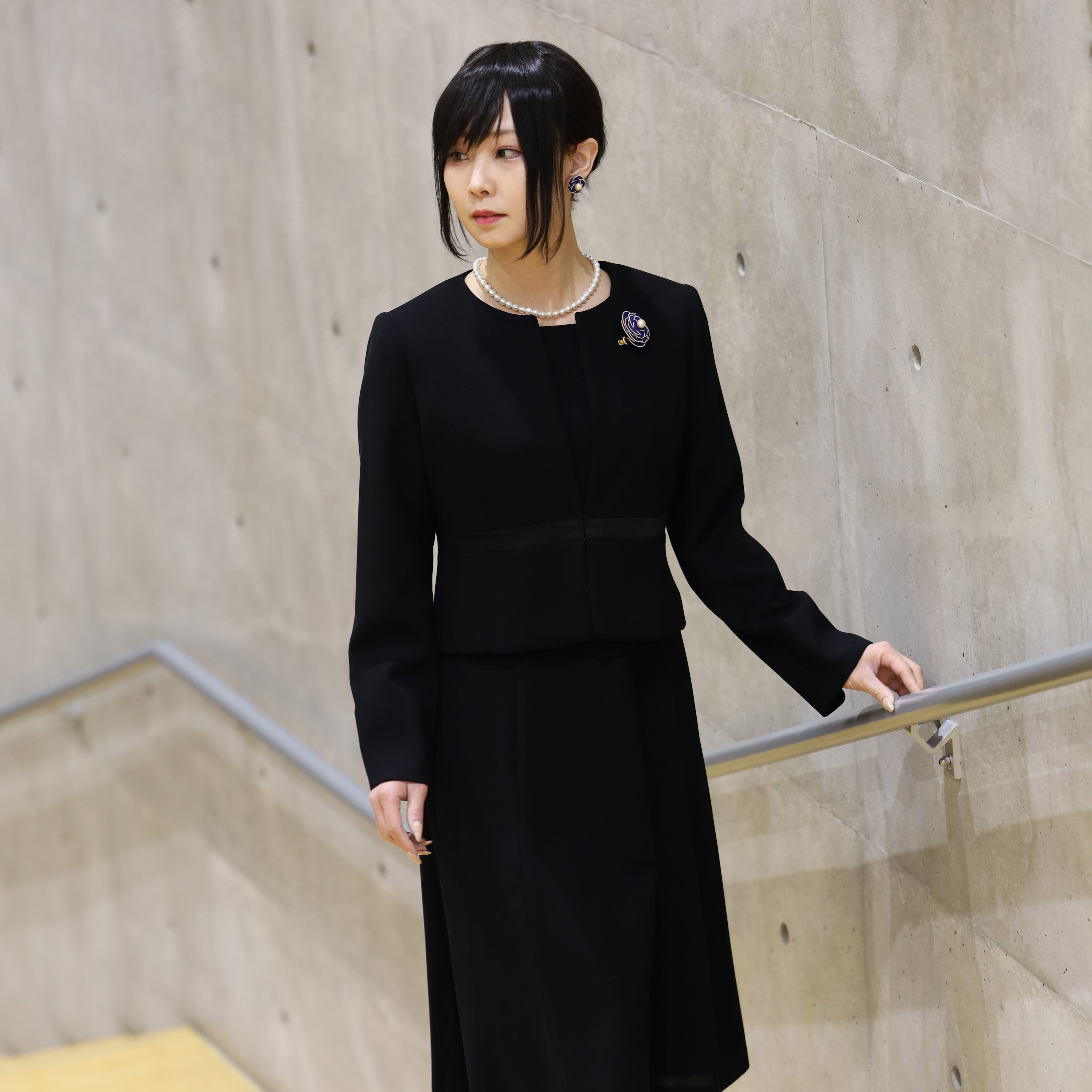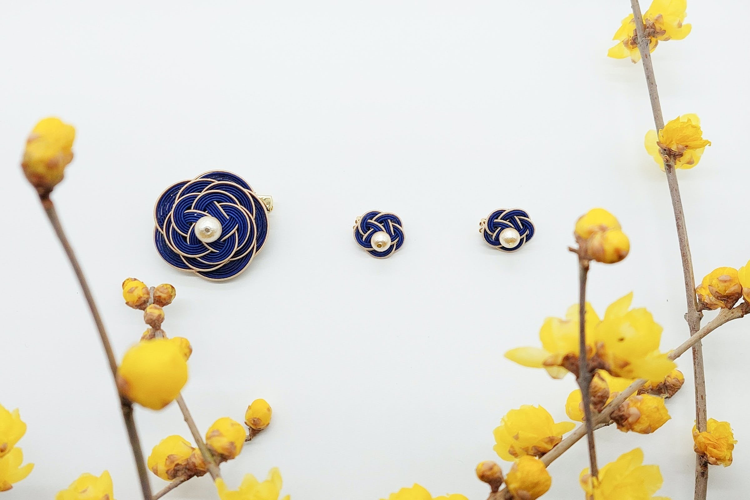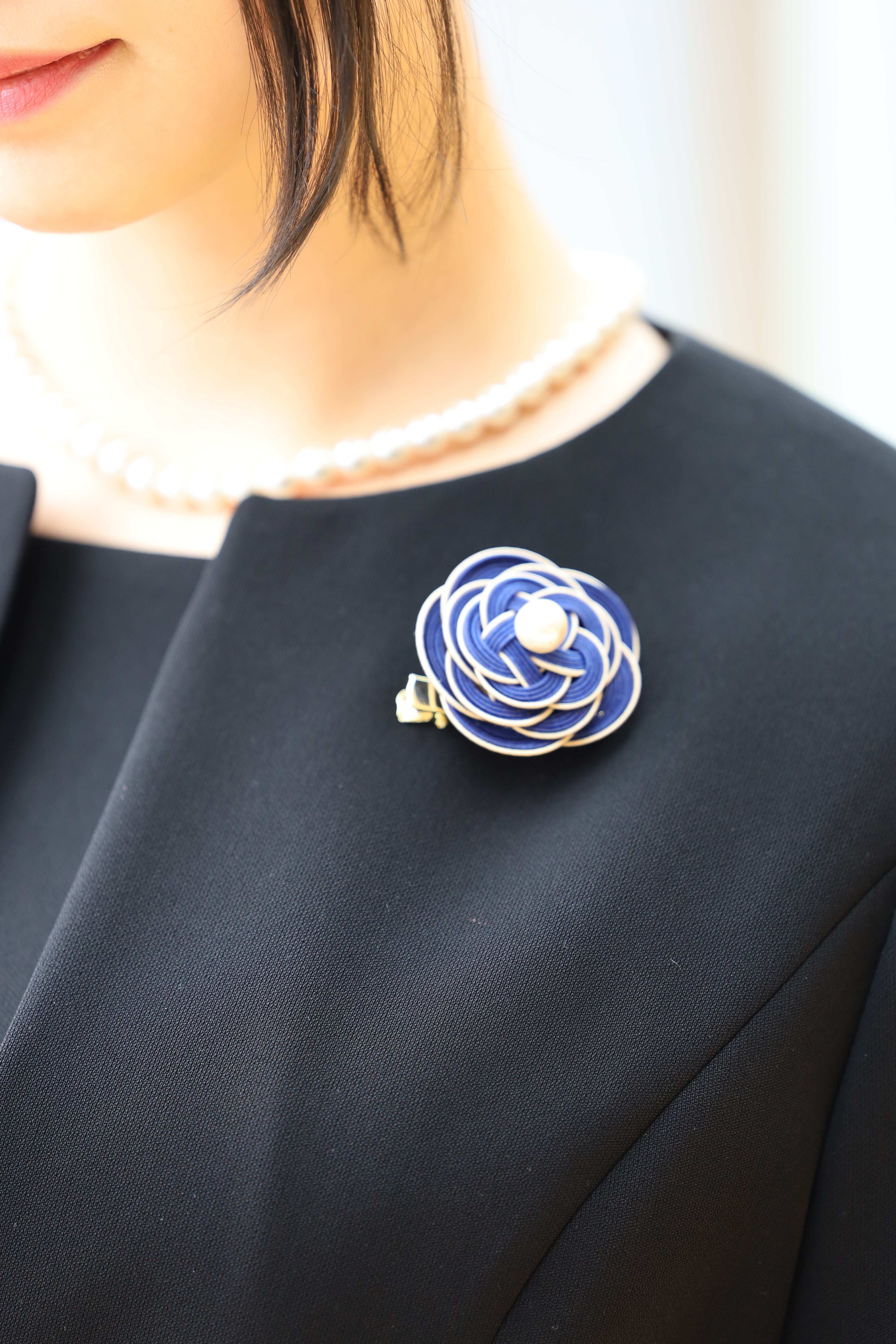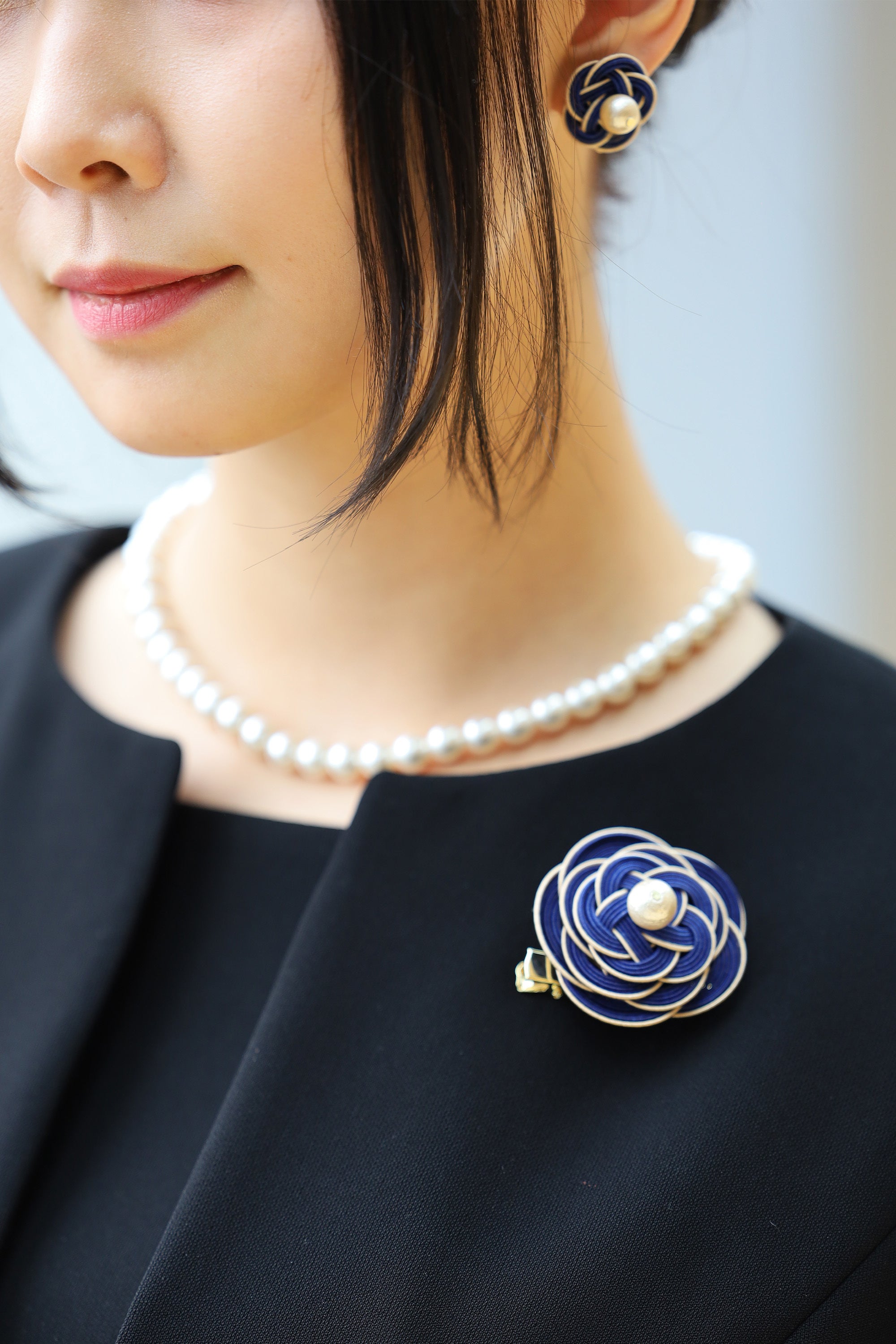 シックで高級感のある紺のブローチ・イアリングセットは、卒業式などの厳かなシーンにも映えるアクセサリーです。
