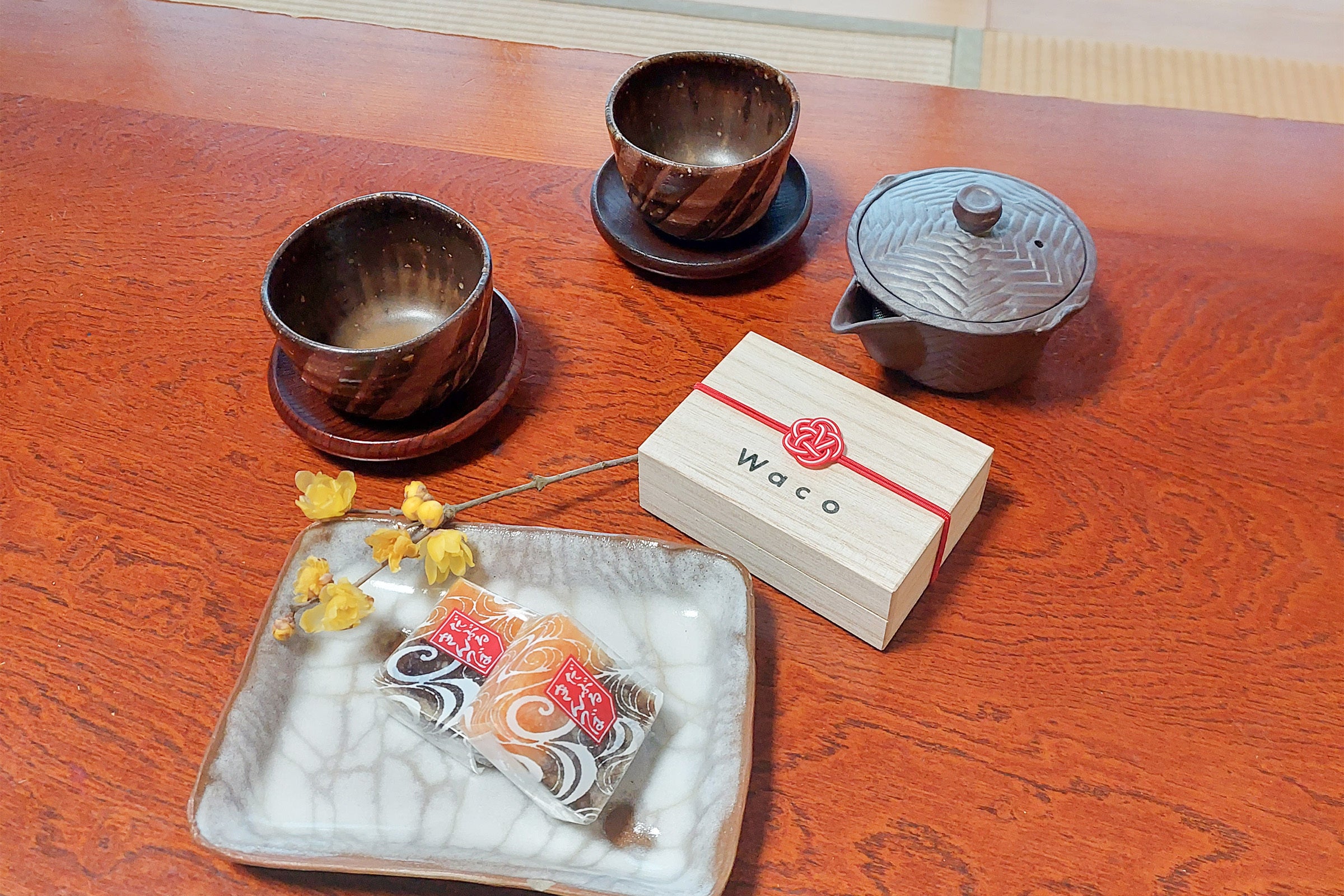そんな中、チェックインして、部屋に通されて、テーブルの上に、お出迎えのお茶とお菓子がある。  ふと見ると、桐箱も一緒に添えられてる。