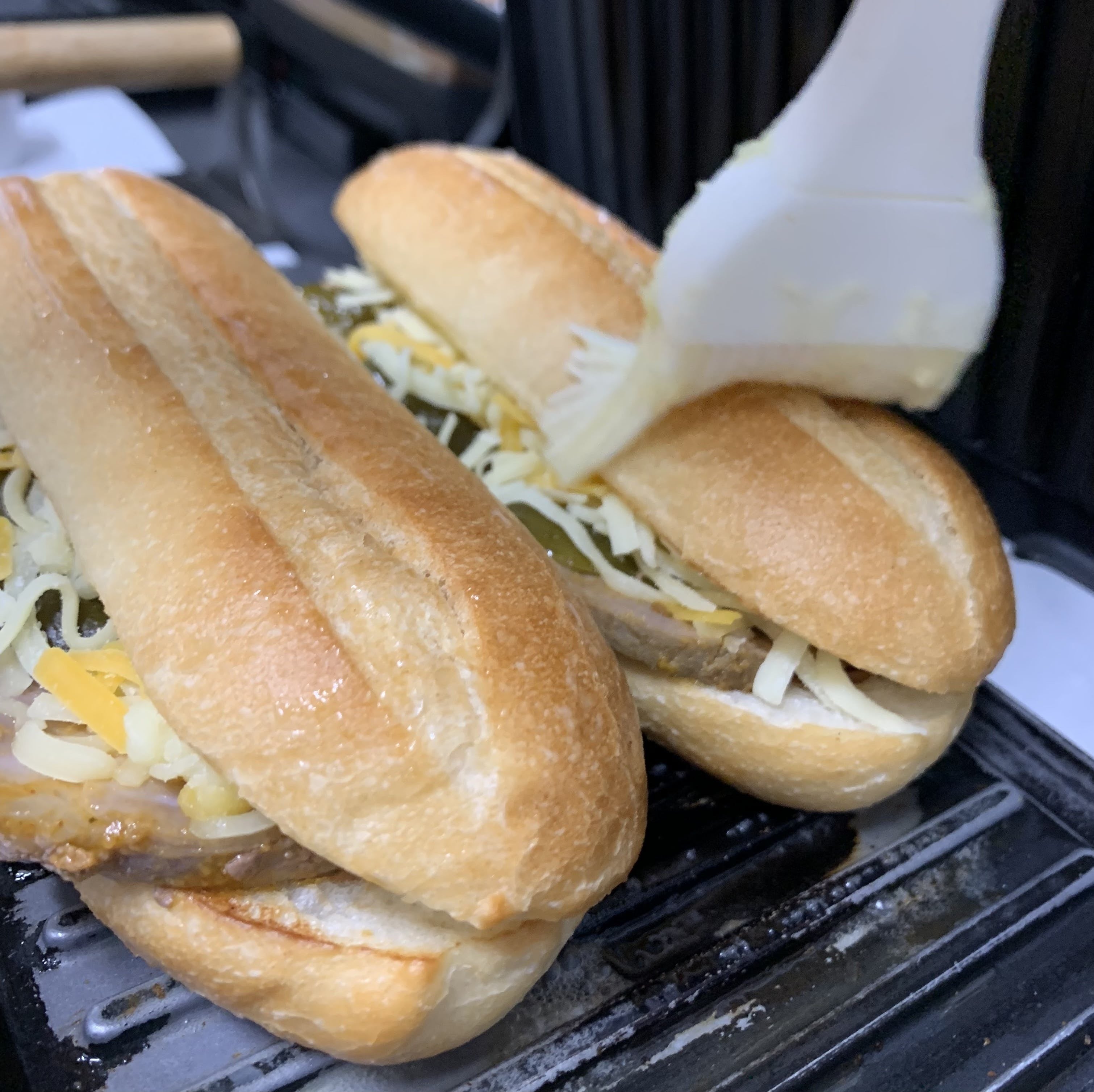 パンにマスタードを塗り、モホローストポーク、ハム、チーズ、ピクルスを挟み、バターをたっぷり塗ったら、プレスでギューッと潰して焼きます。