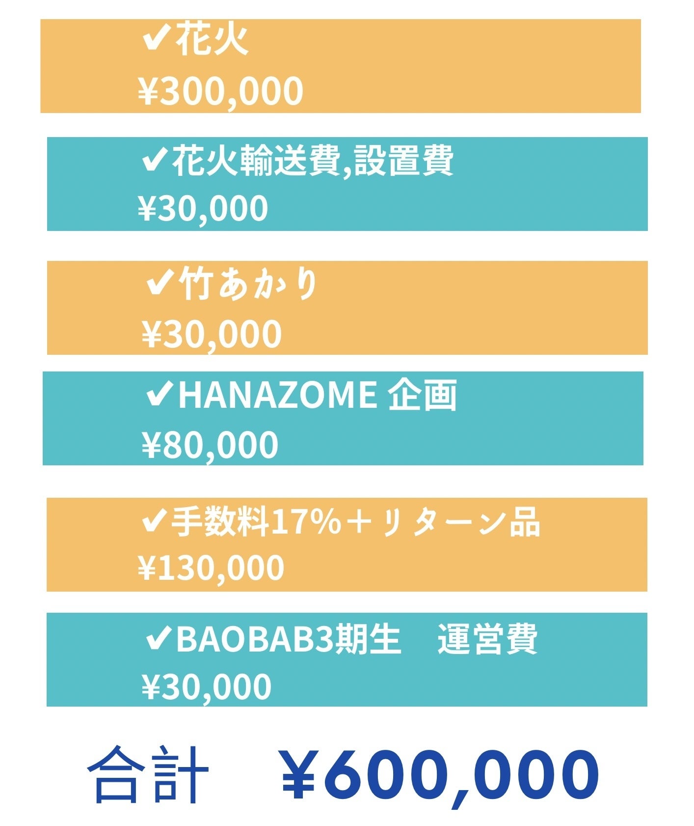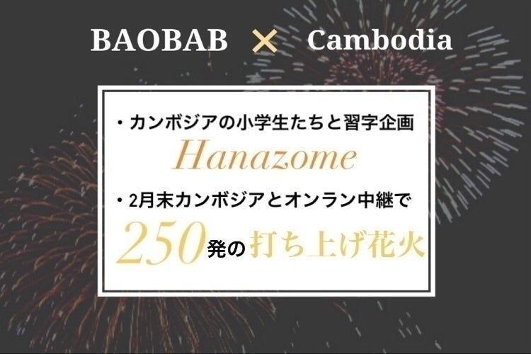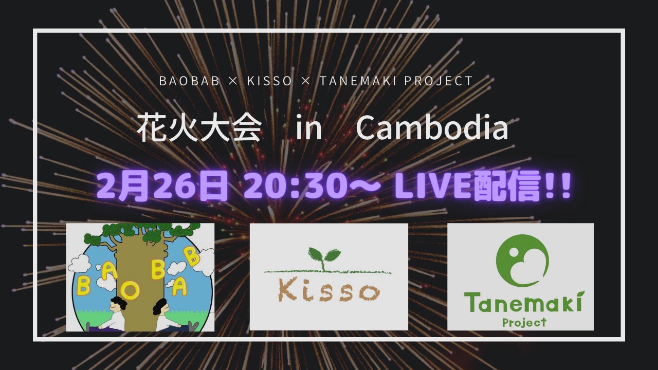 2022/02/26 16:08この度は、学生団体BAOBABの企画にご支援頂き本当にありがとうございました!!!皆様のご協力のおかげで、156,000円のご支援を頂くことができ、無事に花火当日を迎えることができました。皆さんの想いをしっかりと形にし、最後まで全力で笑顔と感動を届けます!!!【企画当日の詳細】・開催日時花火大会・・・2022年2月26日※スケジュール(日本時間)20:00〜開会式20:30〜現地中継21:00〜花火スタート 21:30頃終了・開催方法カンボジアではオフライン、日本ではオンラインで開催します。また、その様子はYoutube、Instagramにてライブ中継させていただきます。▼配信URLhttps://youtu.be/K_WvkECpbIE▼BAOBABのInstagram www.instagram.com/baobab_cambodia上記の形式で世界中の方々に花火を届けます。 是非ご覧ください!!BAOBAB一同 もっと見るご支援ありがとうございました!~これからの日程のお知らせ~