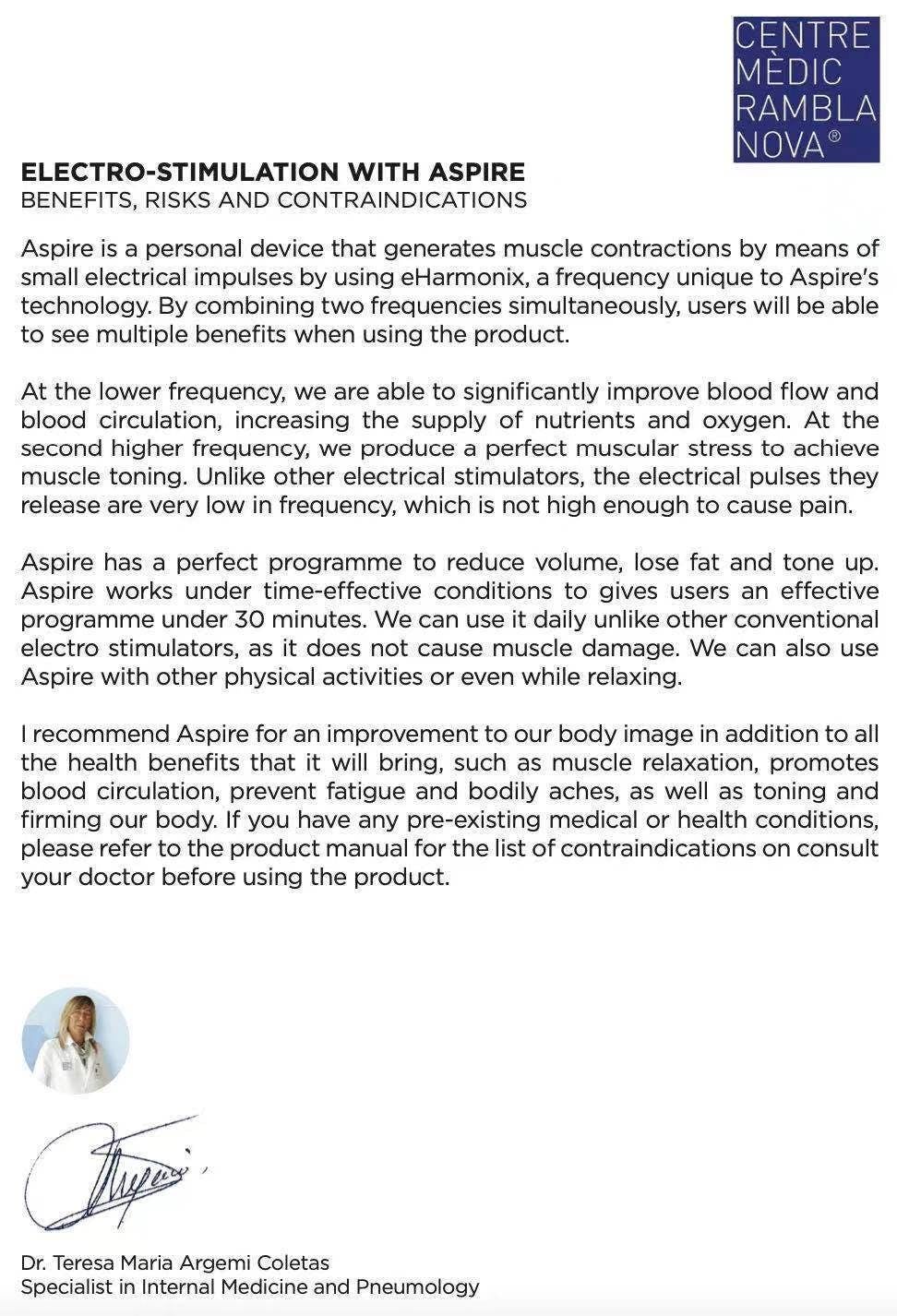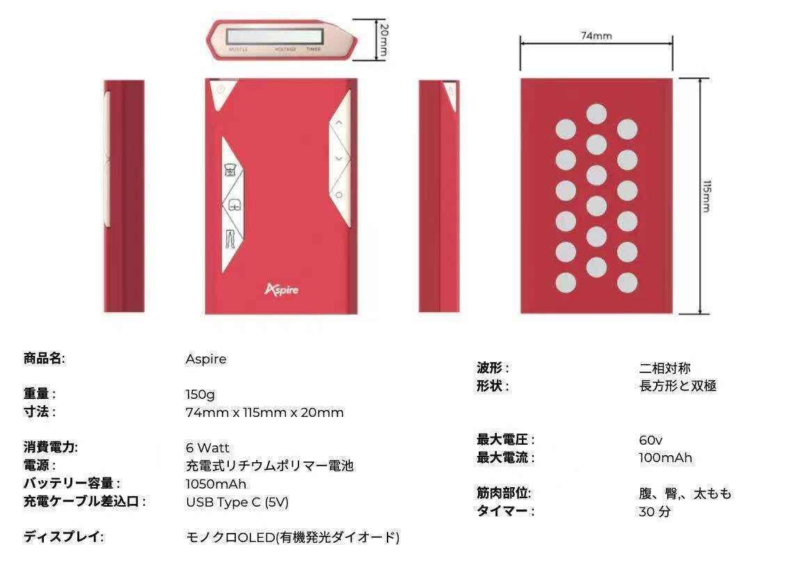 Aspire(アスパイア)は、シンガポールに拠点を置くAlpha Bodytec社が開発した、下半身の引き締めに使える、EMS技術を採用したフィットネスパンツです。最新の独自技術により、人間工学に基づき個々の身体にフィットするよう設計されています。Aspireは、EMS技術により筋繊維を刺激し筋肉を引き締めて、血行を良くすることができます。Aspireの選択モードでは、年齢、性別体力に合わせて強さの調整が可能です。