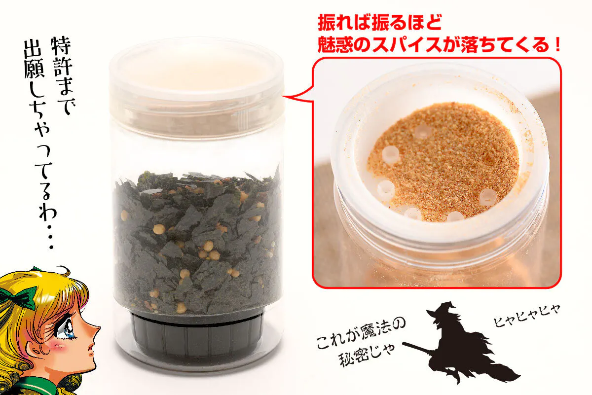 私が500種類以上のふりかけを食べ比べる中で、「こんなふりかけがあったらいいな〜」と妄想を膨らませ続け、試行錯誤を重ね開発した、味変用の粉末入りカートリッジを蓋にセットしています。(特許出願中、意匠登録出願中。)
