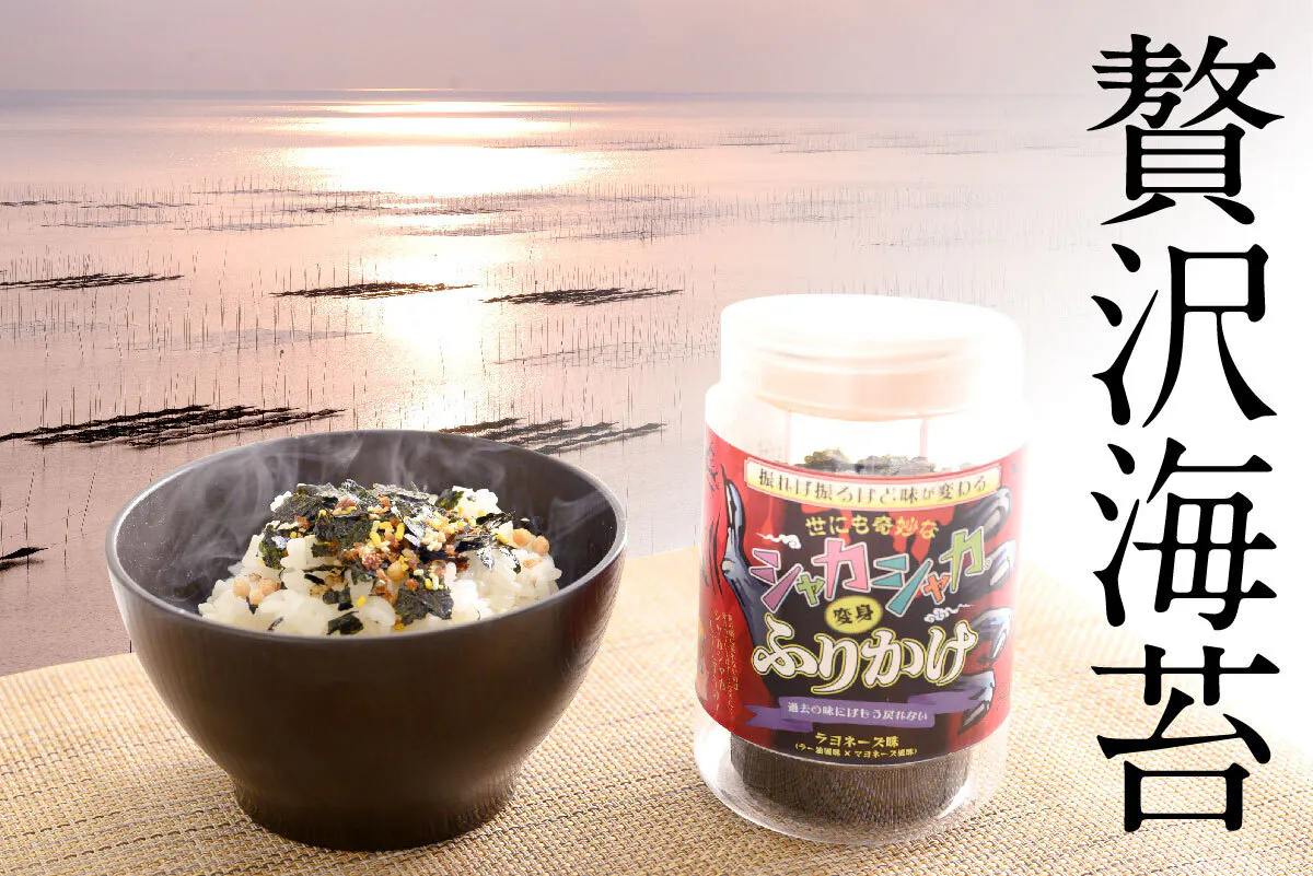 今回のふりかけ開発を協力してくれたのは、熊本有明海産の焼き海苔や味付け海苔を製造販売されてる住吉海苔本舗です。風味豊かな磯の香り。若摘みの上質海苔を使用し、厳選した素材からつくりあげた「秘伝のタレ」で味付した住吉海苔自慢の贅沢海苔ふりかけ。