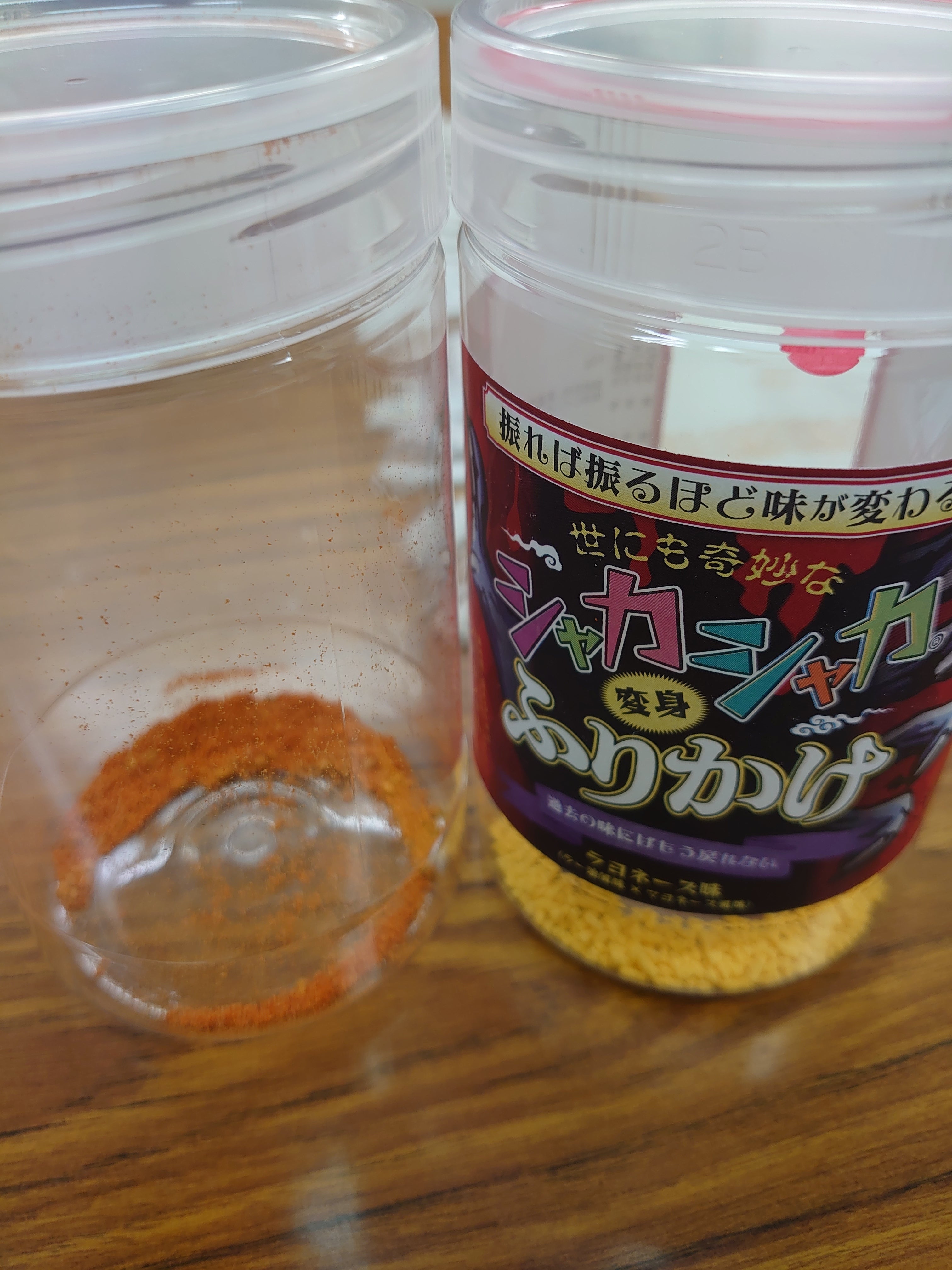 また、ふりかけだけではなく、このシャカシャカ®ふりかけ容器にお菓子(ポップコーン)や珍味(スルメイカ)等を入れてシャカシャカすると味がつき、振れば振るほど味が濃くなります。