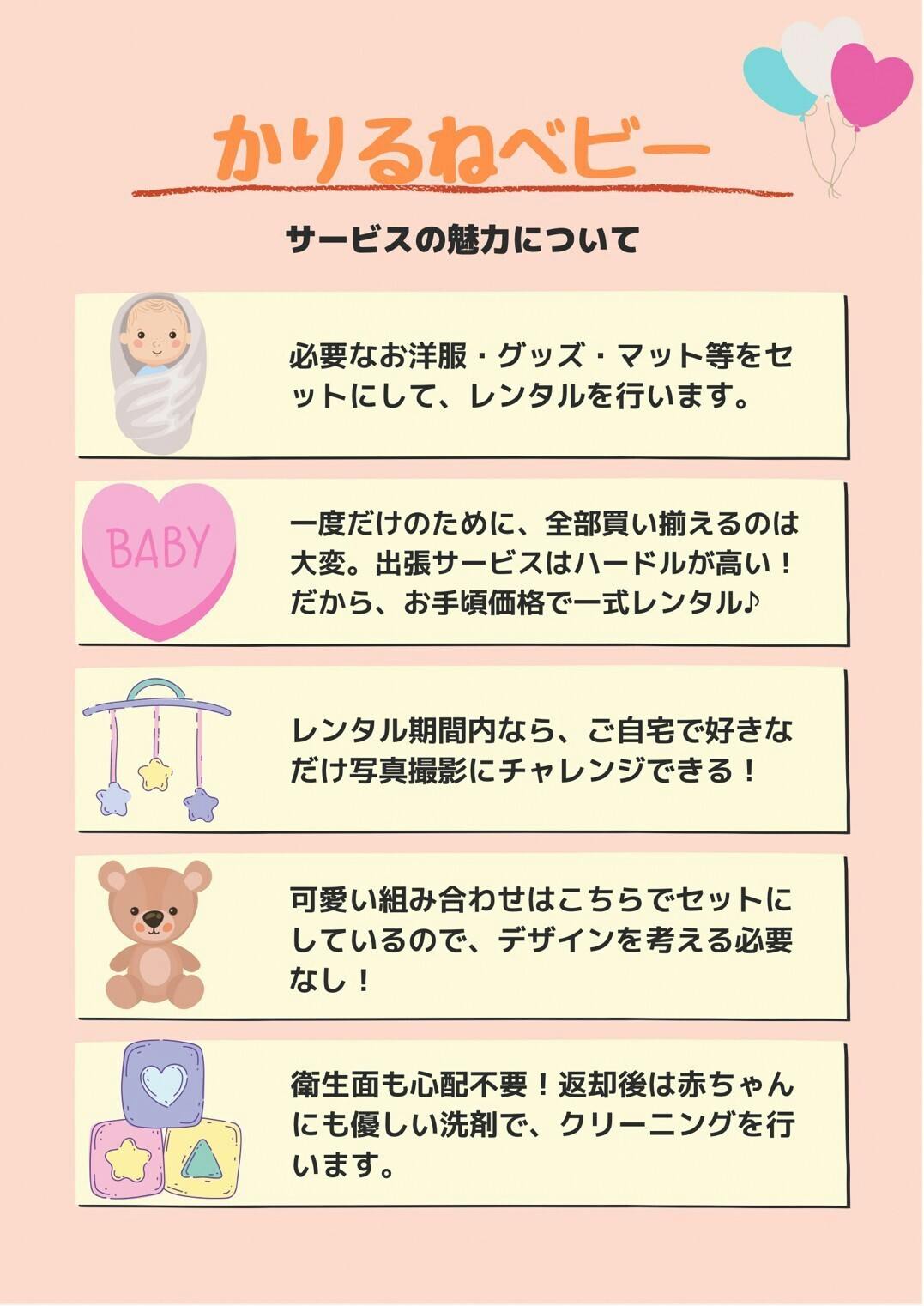 私たちは、今流行りのベビーフォトを簡単に体験したいパパママのために、グッズのレンタル事業を始めたいと考えています。