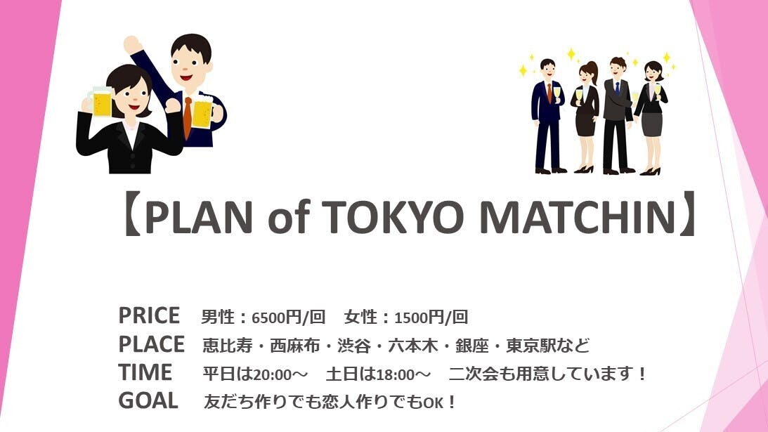 「東京マッチン」は、渋谷、恵比寿、西麻布、六本木、銀座、東京駅などの居酒屋やダイニング、バーなどで毎日開催する、参加者NO.1の今もっともアツい都内最大の飲み会マッチング。婚活パーティーや合コン、街コンとも違う“新しい男女の出会い方”が「東京マッチン」のスタイル。男女が出会いカップル誕生もあり、男性同士、女性同士の友情が芽生えることもあり、仕事で繋がることも!異性だけでなく、同性の友だちもできて、異業種交流もできるのが「東京マッチン」です!
