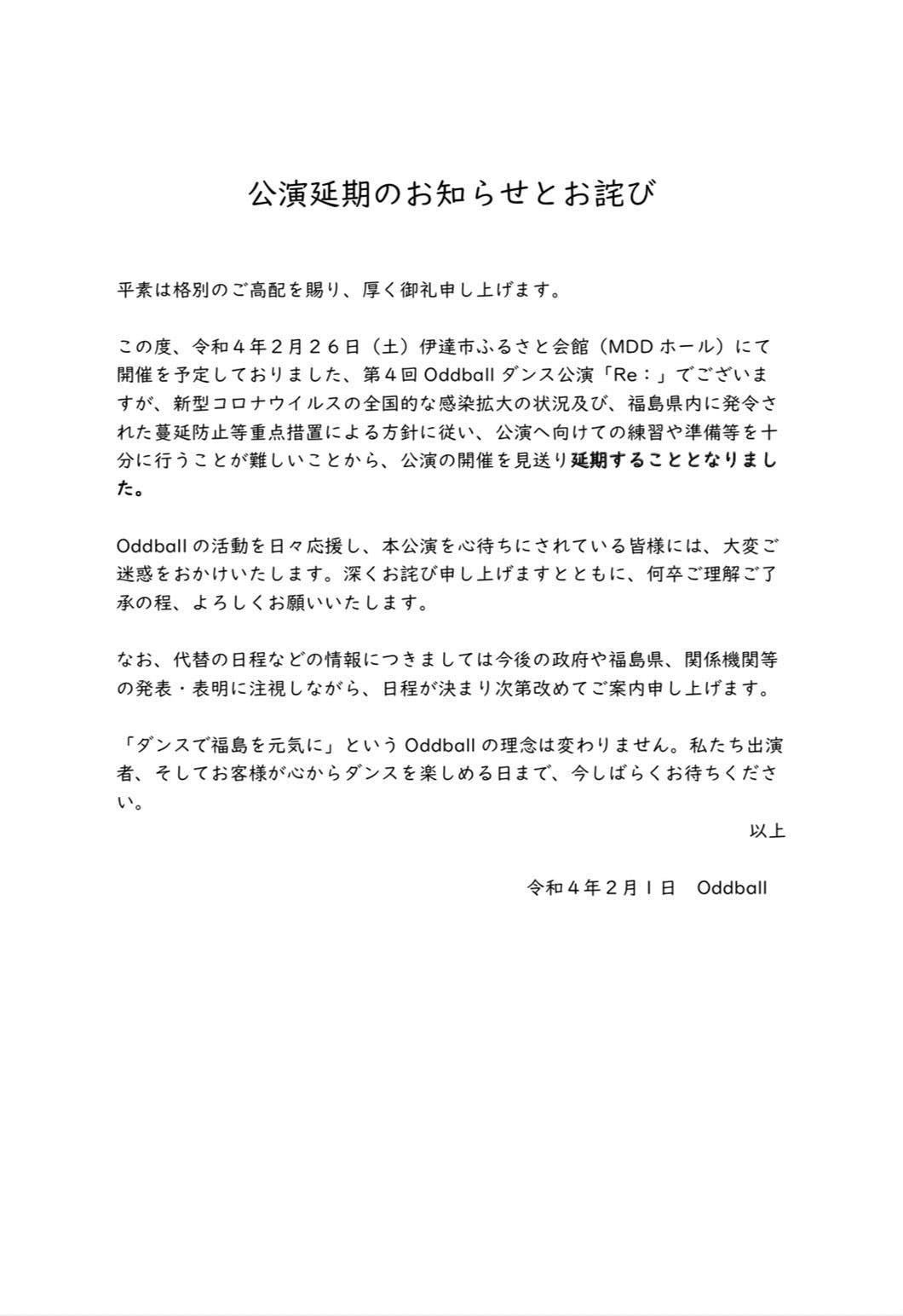 この度、令和4年2月26日(土)伊達市ふるさと会館(MDDホール)にて開催を予定しておりました、第4回Oddballダンス公演「Re:」でございますが、新型コロナウイルスの全国的な感染拡大の状況及び、福島県内に発令された蔓延防止等重点措置による方針に従い、公演へ向けての練習や準備等を十分に行うことが難しいことから、公演の開催を見送り延期することとなりました。