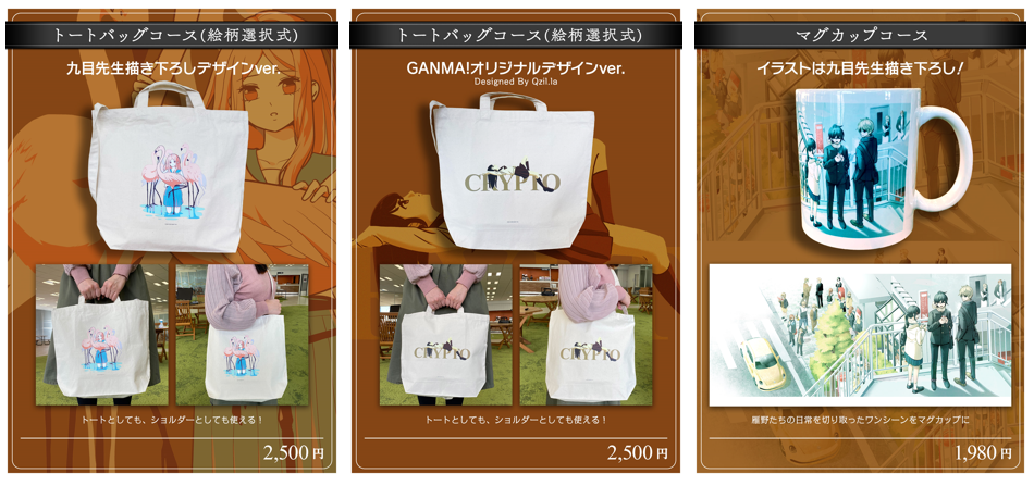 ┗キャンバス生地のショルダー×トートの2Wayバッグに九目先生デザインのものと、GANMA!オリジナルデザインの2種類をご用意していますので、お申込み時にご希望の絵柄を選択してください。