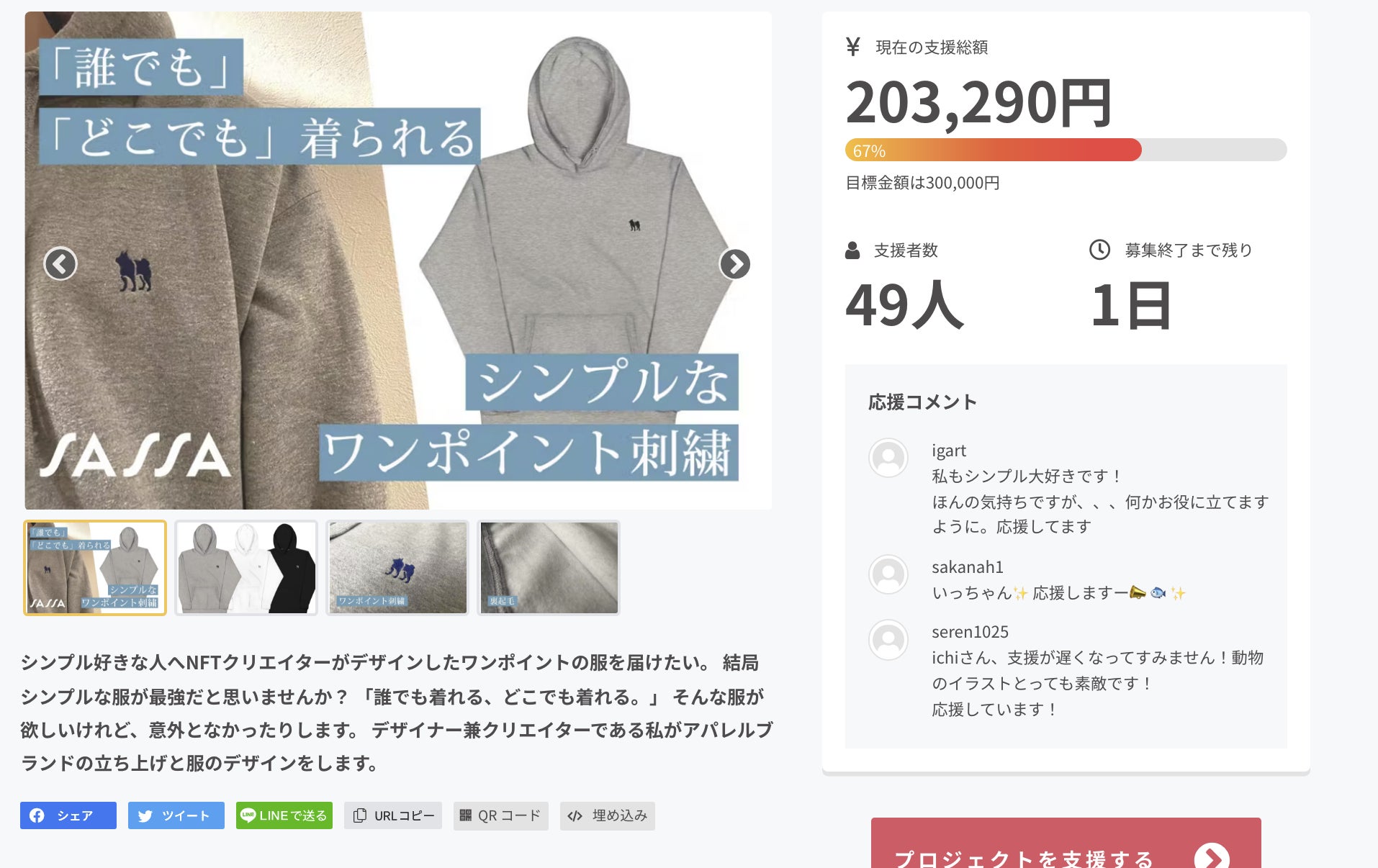 2022/01/20 11:05ついに明日プロジェクト終了します!明日(1/21 23:59)に終了します。現在の達成率は67%です!ここまで49名もの方にご支援いただきました。ありがとうございます...49名の方にご支援いただくというのは、純粋にすごいことだし嬉しいことです。これだけでも嬉しくて頑張れそうです...ただ!残りあとわずかですが達成率100%をもちろん諦めておりません!目指しております!もし少しでも興味があるという方がいらっしゃいましたらご支援をお願いいたします...!最後まで頑張って参りますのでよろしくお願いいたします。※本プロジェクトはAll-in方式で実施します。目標金額に満たない場合も、計画を実行し、リターンをお届けします。 もっと見る