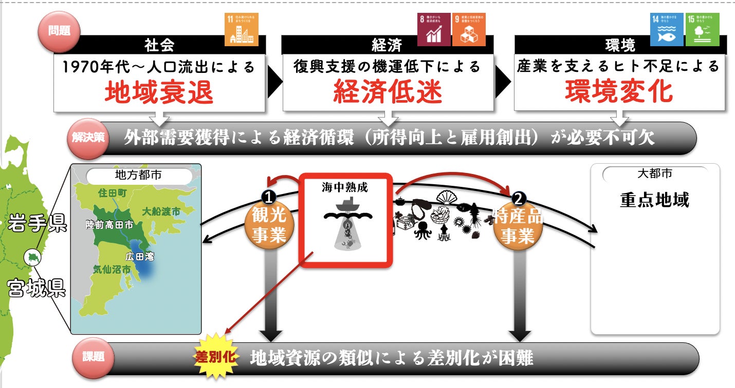 そこで世界でも珍しい海中熟成体験を軸に、地域の観光スポットや小売や飲食店など陸前高田周辺の魅力をお届けし、観光サービスや特産品で地域に経済効果を循環させることを目的としております。