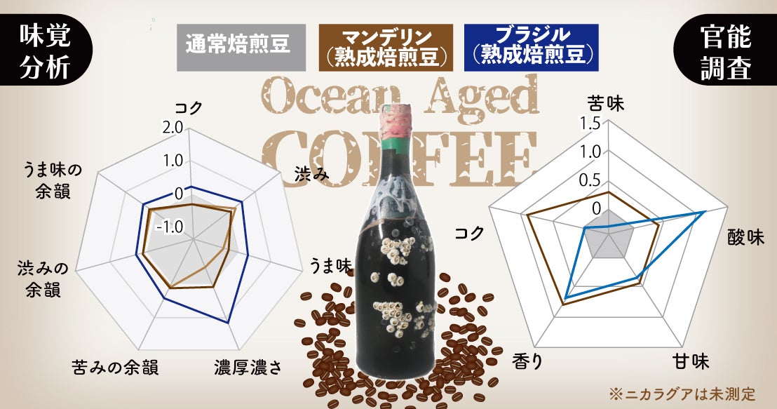 海中熟成の前後における味の変化を(1)機械による測定 と (2)試飲会におけるアンケート調査 を実施したところ、以下のように味の変化が判明しました。