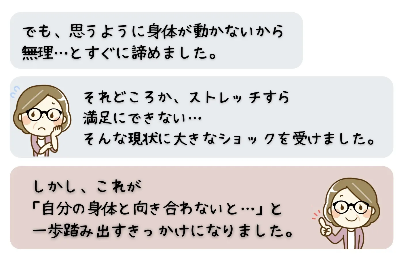 身体が思うように動かなかったり、できない自分を目の当たりにして落ち込んだりしましたが、それがきっかけになり、「セルフケア」の大切さを痛感しました。