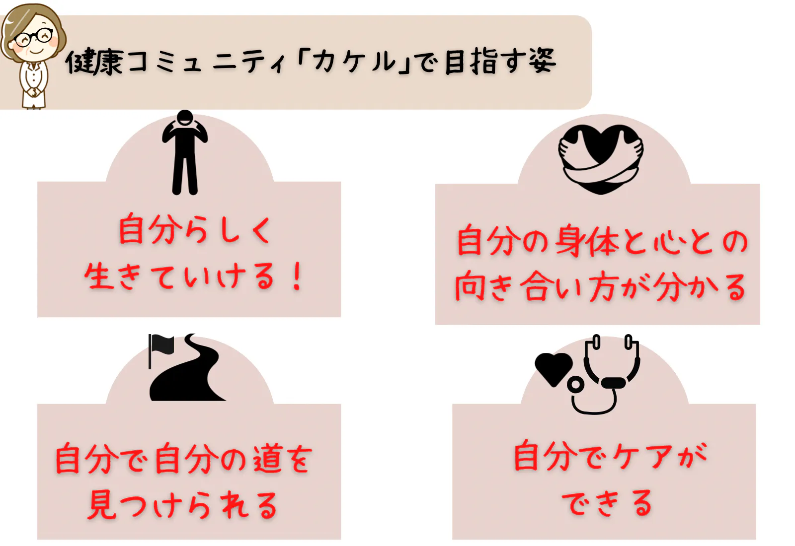 健康コミュニティ「カケル」を構築して、心身ともに健康で幸せな女性を、一人でも多く増やしたいと考えています。