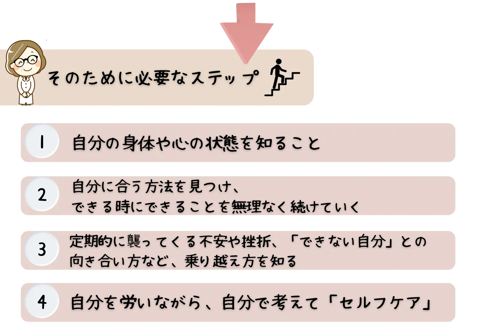 生涯健康でいるためには、年齢にかかわらず、自身に合った心身のケアを知り、自分でケア(=セルフケア)していくことがとても重要なのです。