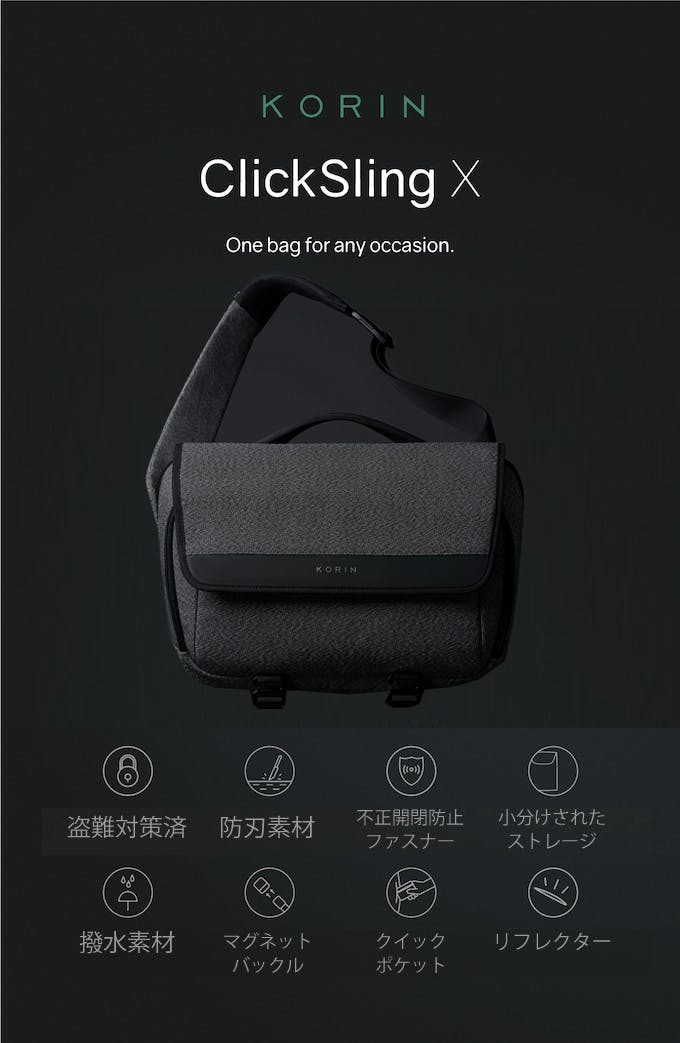 ただいまKORIN DESIGNの盗難防止設計のスリングバッグ