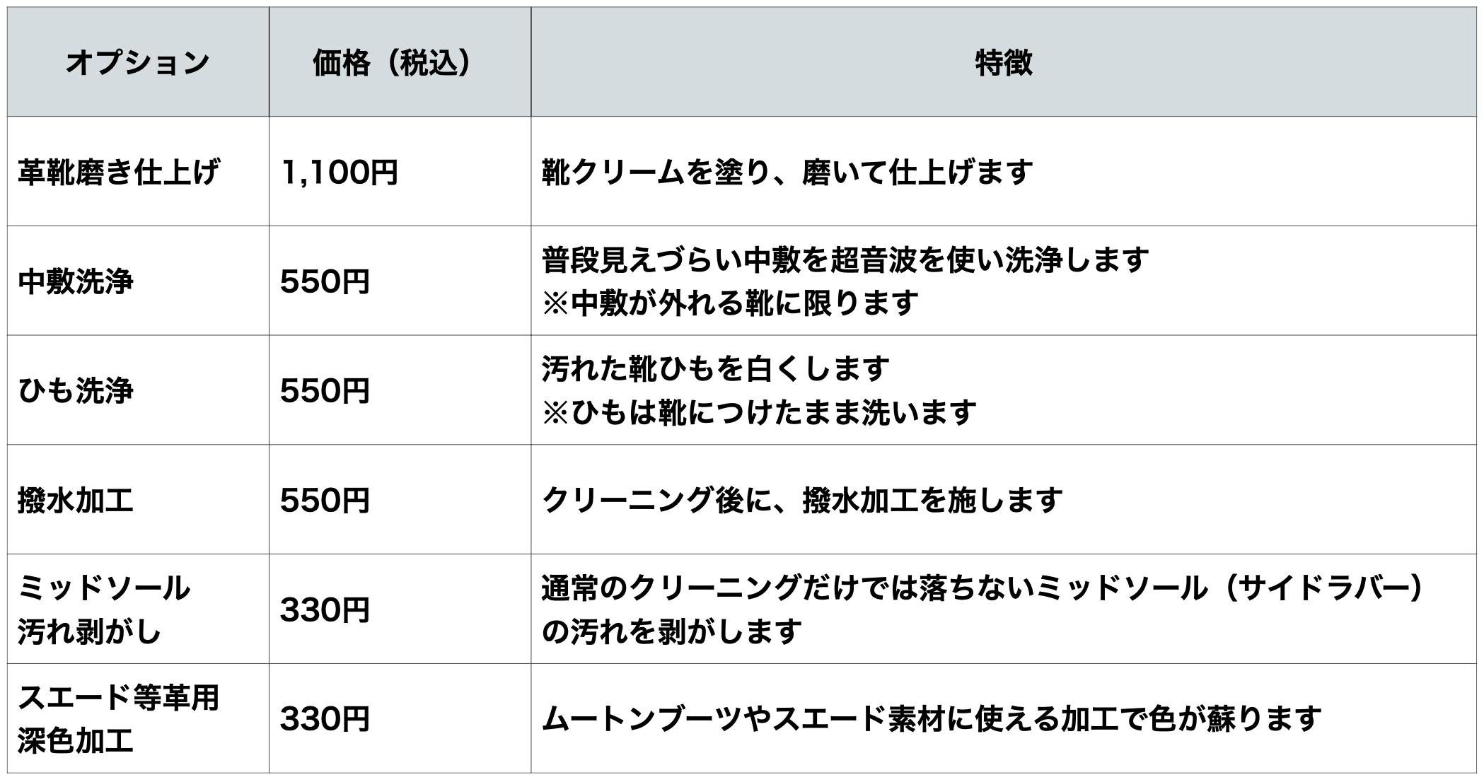 クリーニング費用と有料オプションは以下の通りです。