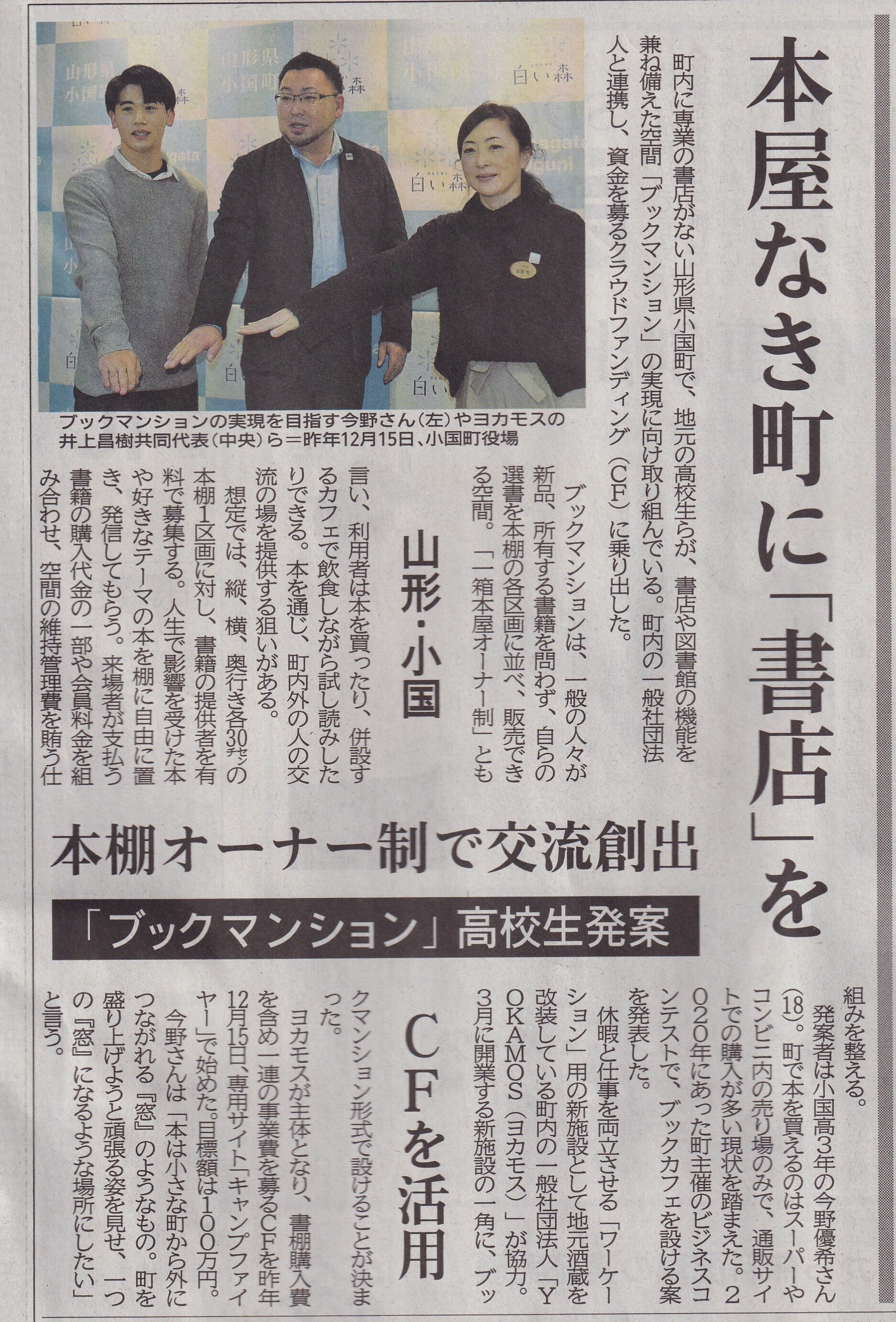 皆さまのご支援のおかげで、目標金額の54%を達成することができました。本当にありがとうございます!先日の河北新報の掲載記事に続き、山形新聞の2022年1月9日(日)の紙面に、今回のプロジェクトの記事が掲載されました。ぜひ、ご一読ください。地元紙ということで反響も多く、より多くの方々に私どもの取り組みを知っていただければと考えます。引き続き『300年以上続く「桜川酒造」に併設した石蔵に酒蔵図書館・テレワーク拠点を創出』応援お願いします!