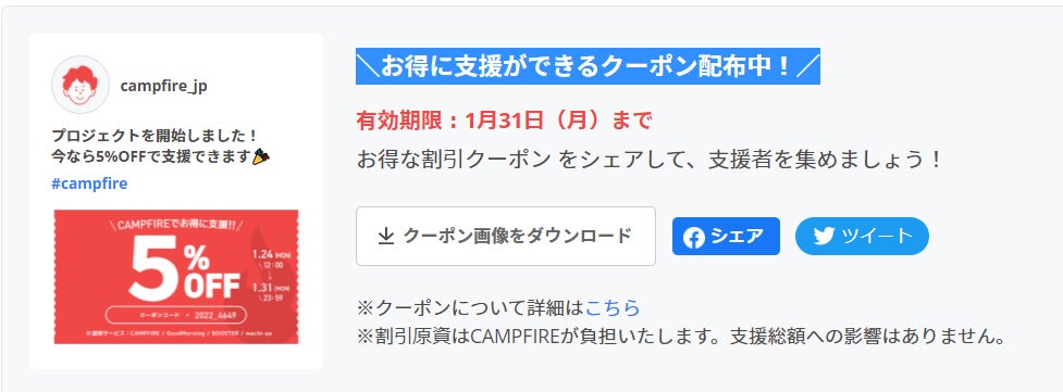 皆さまのご支援のおかげで、目標金額の75%を達成することができました。本当にありがとうございます。現在CAMPFIREで使える「5%OFFクーポン」をプレゼント!キャンペーンが開催されております。期間は1月31日までとなっておりますので、情報の拡散お願いできればと思います。 【クーポン内容】・クーポンコード:2022_4649・クーポン割引率: 支援額から5%OFF・最大割引額:なし・利用可能期間:2022年1月24日(月)12時00分〜1月31日(月)23時59分まで・クーポン利用上限枚数:なし ※期間中お1人様1回まで・対象サービス:CAMPFIRE / GoodMorning / BOOSTER / machi-ya ※下記サービス掲載のプロジェクトは、対象外となっておりますのでご注意ください ふるさと納税 / CAMPFIRE Creation / EXODUS / CAMPFIRE Community 引き続き『300年以上続く「桜川酒造」に併設した石蔵に酒蔵図書館・テレワーク拠点を創出』応援よろしくお願いします!
