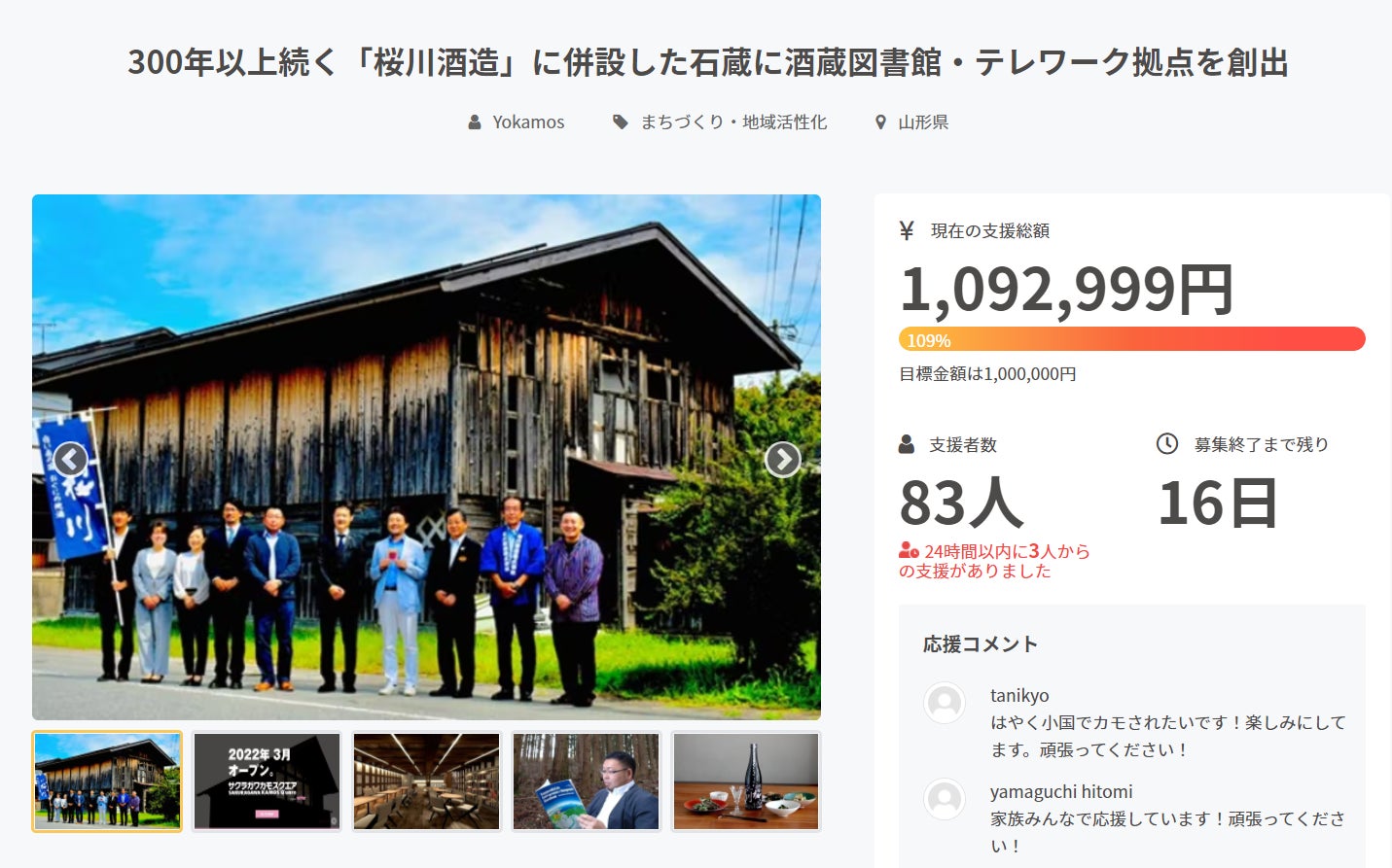 皆さまのご支援のおかげで、目標金額の60%を達成することができました。本当にありがとうございます。今回新たにリターンを追加しましたので、ご報告します。・⑧SAKURAGAWA KAMOS”Q”uare(サクラガワカモスクエア)〒999-1363山形県西置賜郡小国町小国小坂町213「KAMOS”Q”uareオープン記念イベントにご招待。」限定5名様(開店記念品付き)KAMOS”Q”uareの、オープン記念イベントに参加できるリターンなります。※実施時期は2022年3月12日(土)詳細決まり次第、ご連絡します。30000円・学び⑧井上昌樹があなたのために本を選びます!(オンラインでおすすめ本の紹介)※1時間程度「※備考欄にご希望のジャンルをご記入ください。」「有効期限2022年9月から1年間(土日祝を除く)」15000円以上の2つを追加しました。引き続き『300年以上続く「桜川酒造」に併設した石蔵に酒蔵図書館・テレワーク拠点を創出』応援よろしくお願いします!