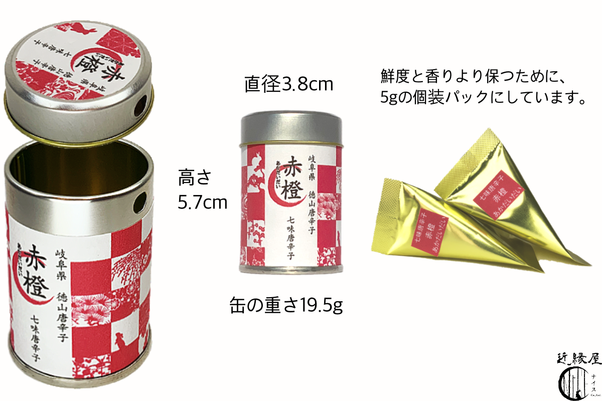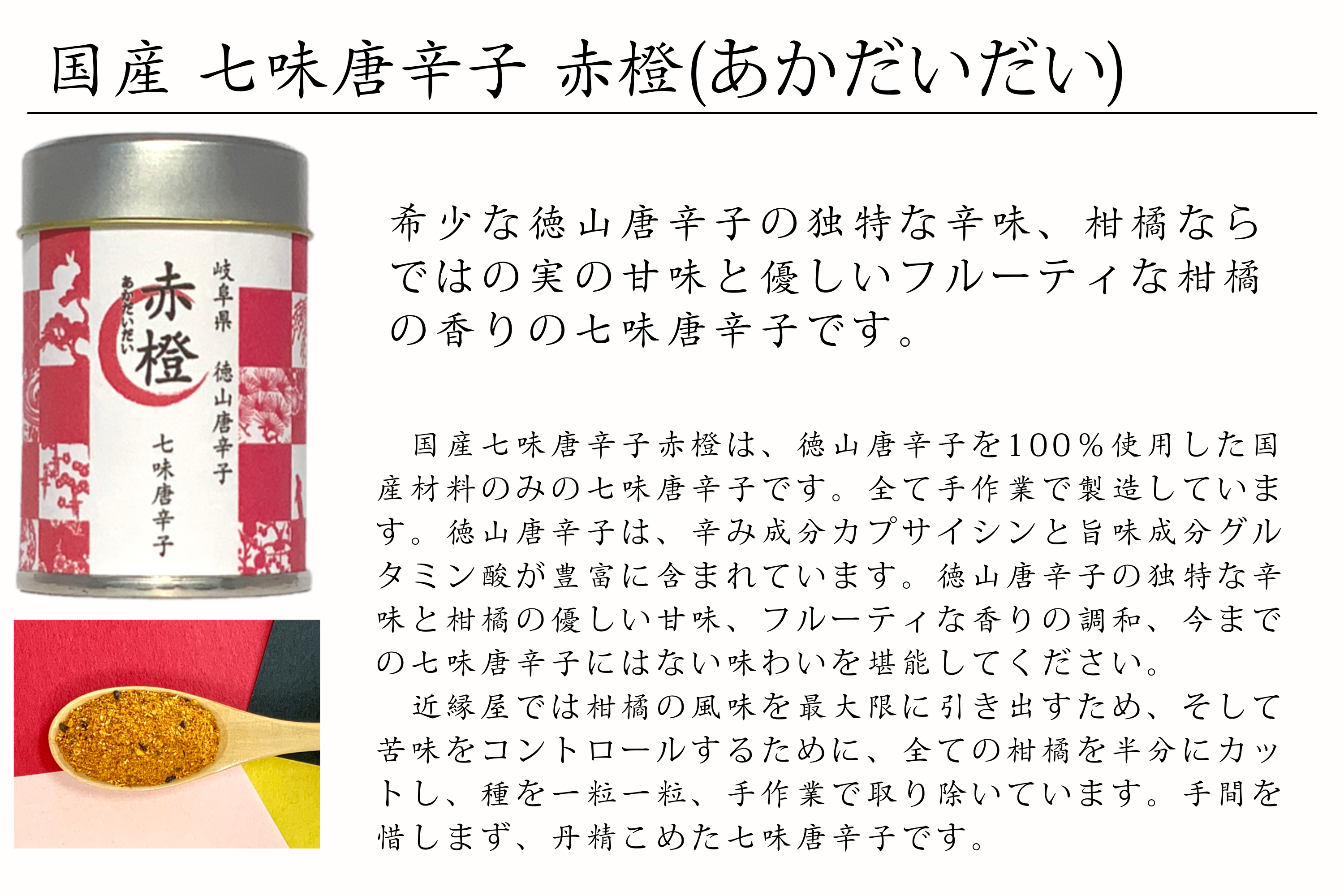 【七味唐辛子赤橙】『赤橙紹介HPリンク』原材料:陳皮、唐辛子、黒ごま、山椒、あおさ、大葉、しょうが※すべて国産