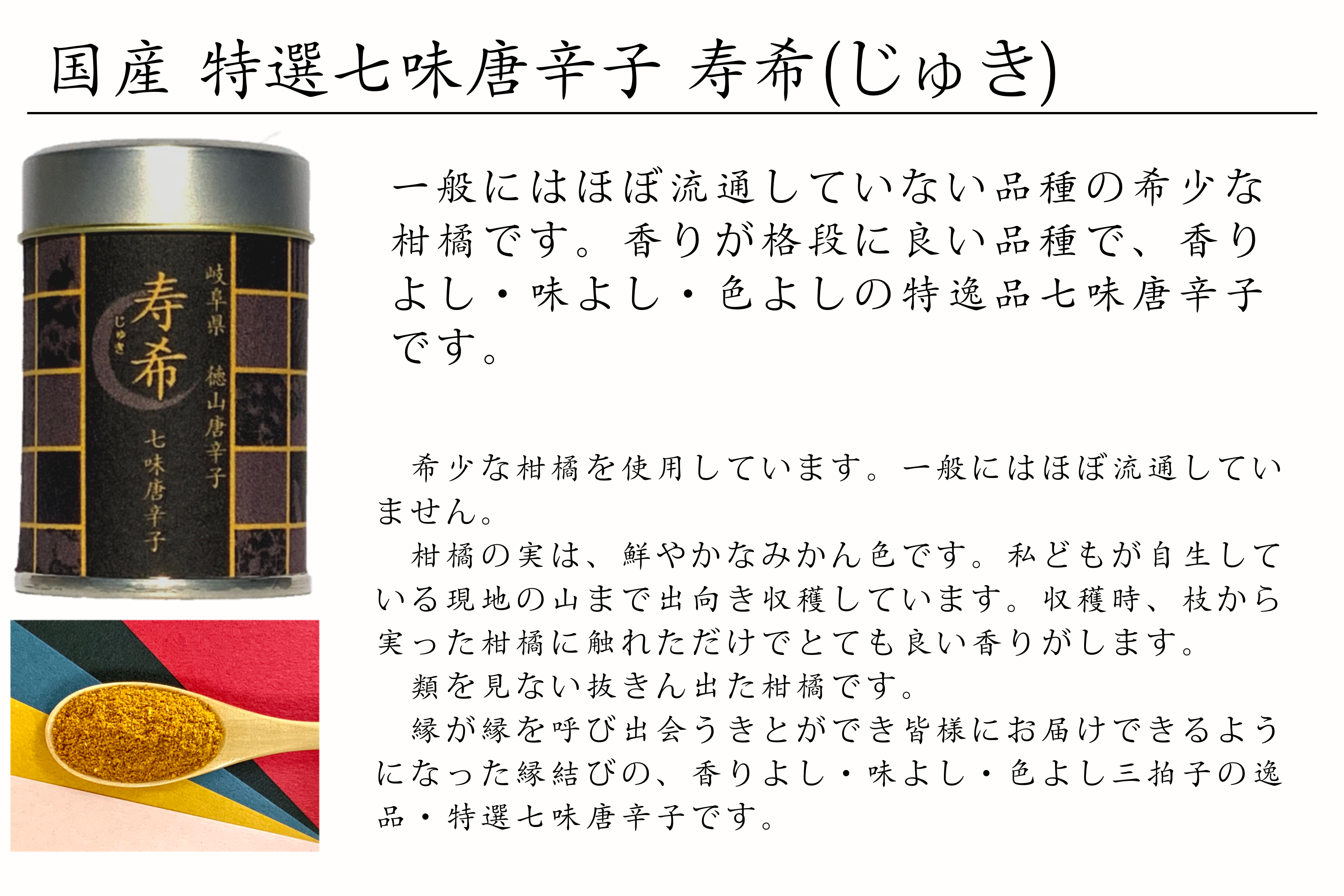 【特選七味唐辛子寿希】『寿希紹介HPリンク』原材料:陳皮、唐辛子、黒ごま、山椒、あおさ、大葉、しょうが※すべて国産