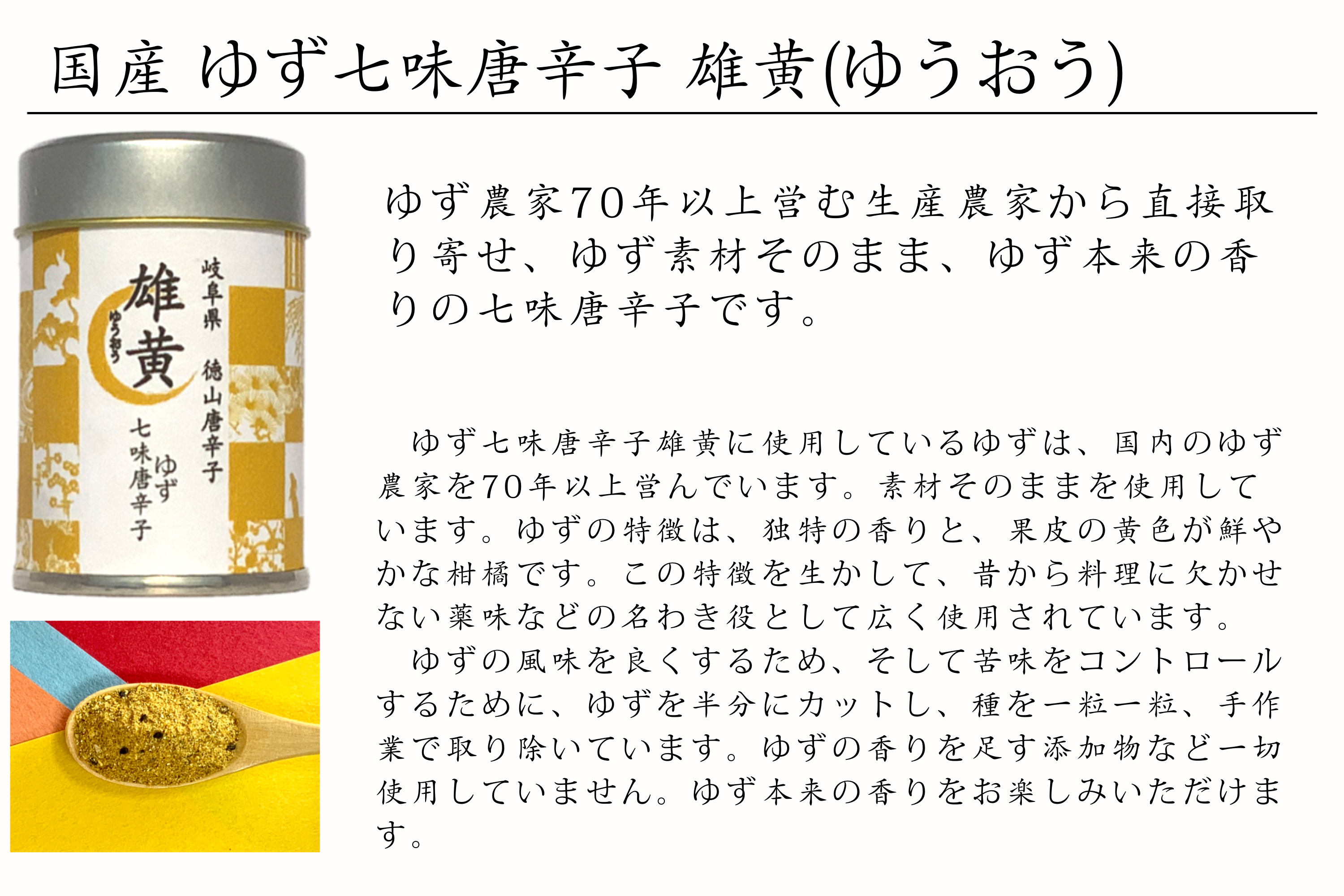 【ゆず七味唐辛子雄黄】『雄黄紹介HPリンク』原材料:ゆず陳皮、陳皮、唐辛子、黒ごま、山椒、あおさ、大葉、しょうが
