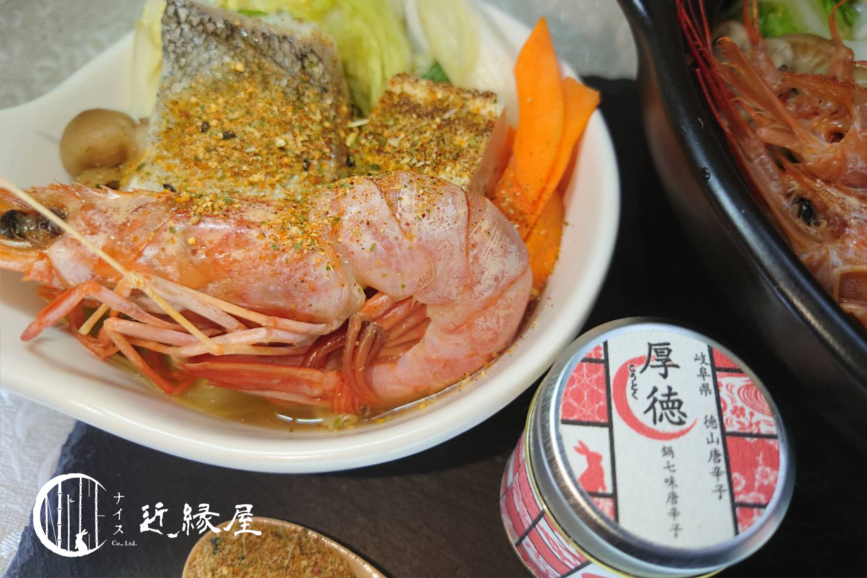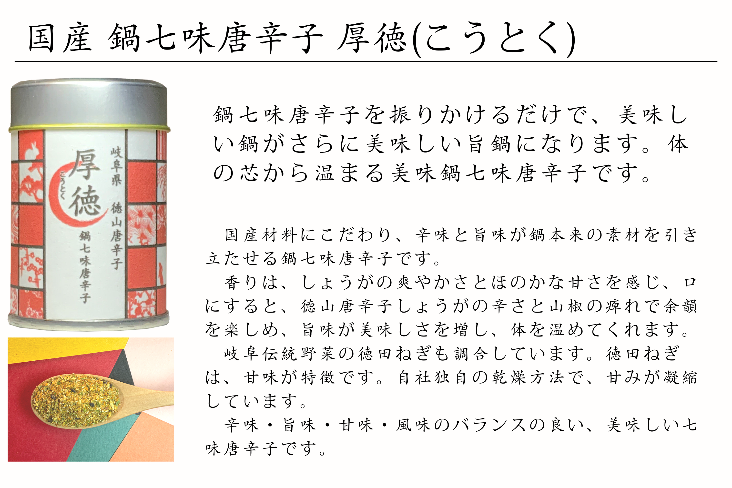 【鍋七味唐辛子厚徳】『厚徳紹介HPリンク』原材料:陳皮、しょうが、ねぎ、唐辛子、山椒、ごま、あおさ、大葉 ※すべて国産