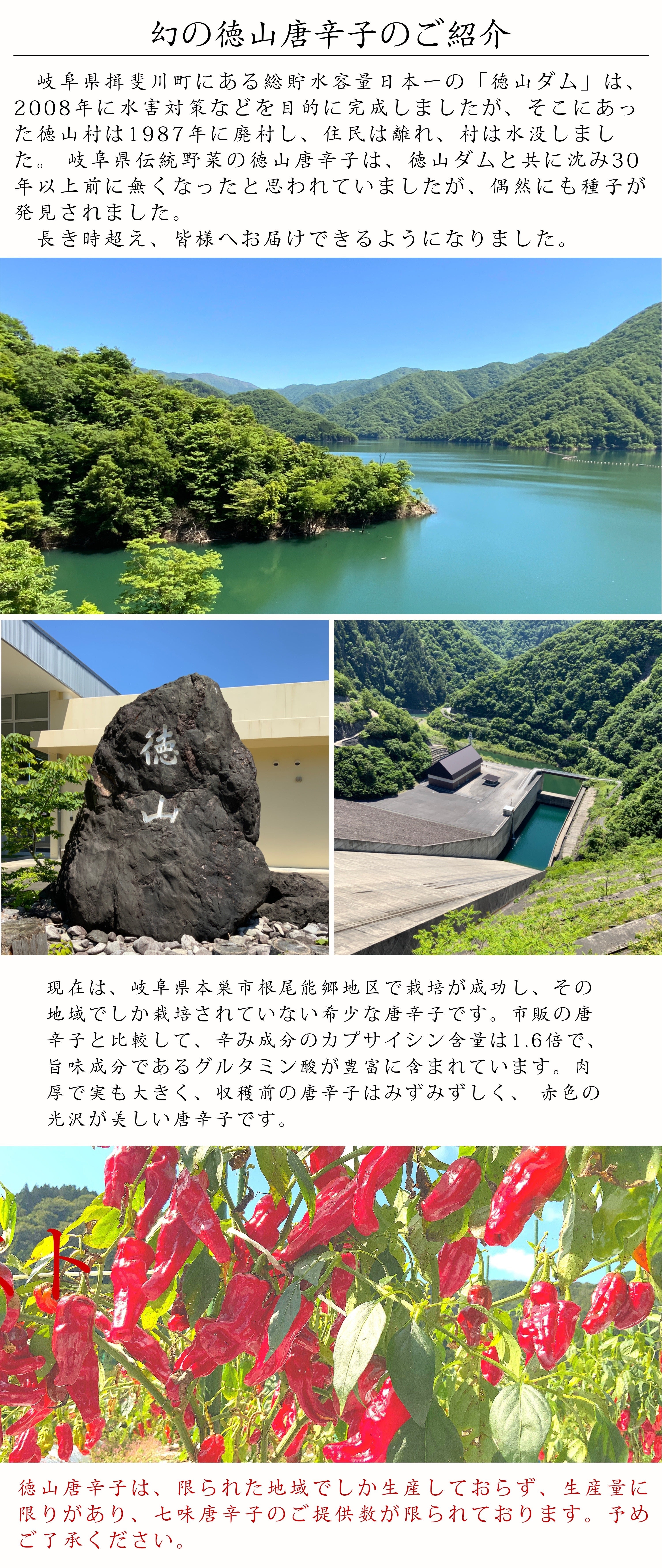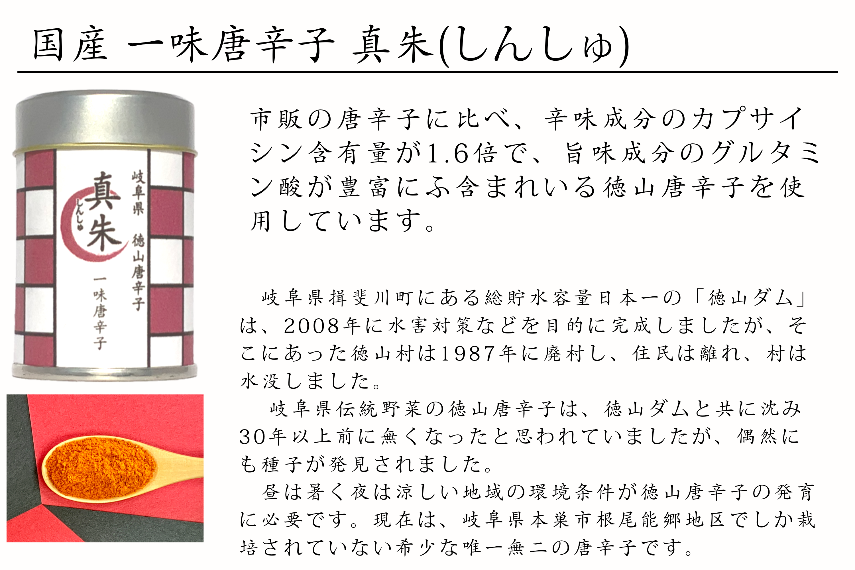 ■一般の唐辛子に比べ辛み成分のカプサイシンが1.6倍、旨味成分のグルタミン酸が豊富に含まれた希少な岐阜県徳山唐辛子を使用しています。