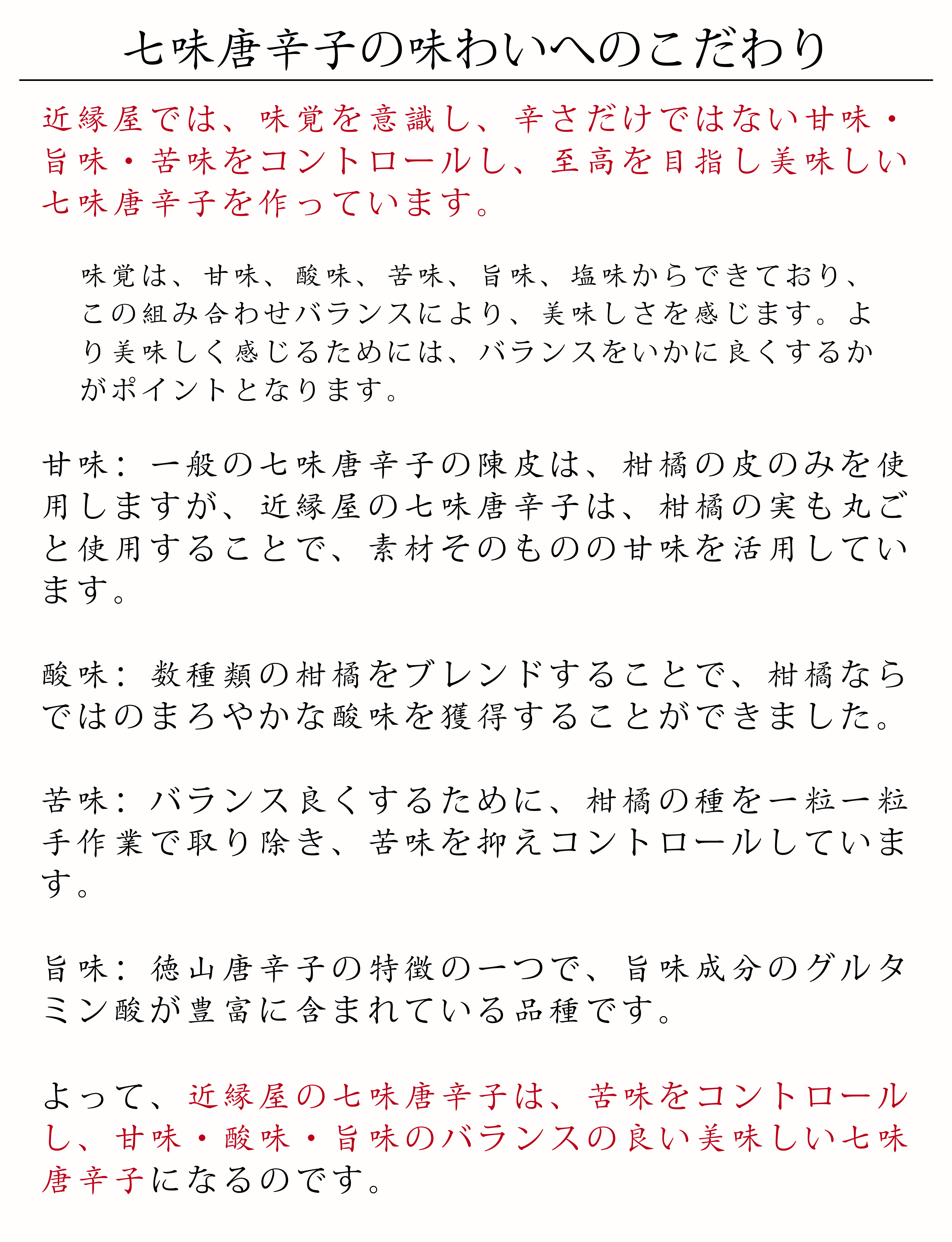 ■なぜかやみつきなる美味しさの秘密。味覚を意識し、辛さだけでなく旨味・甘味・酸味の揃ったバランスの良い、苦味さえもコントロールされた美味なる七味唐辛子です。