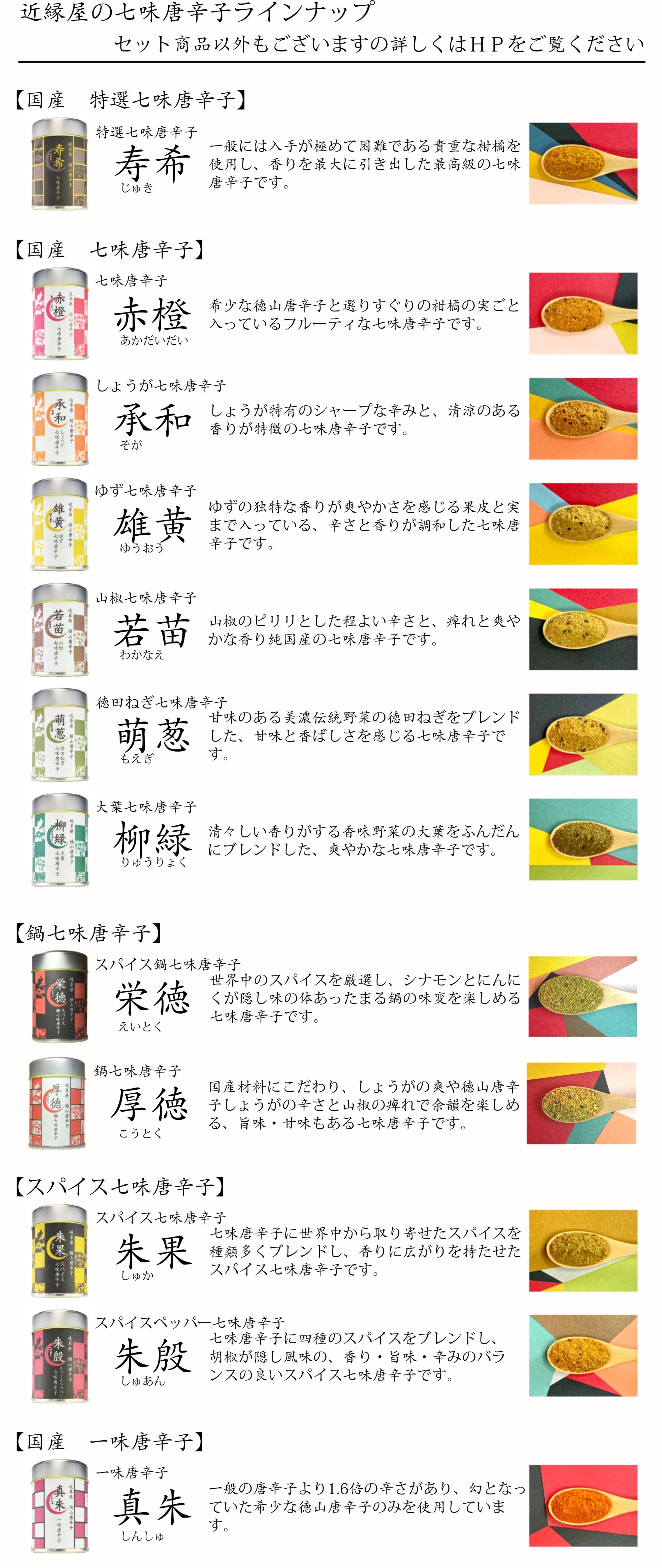 近縁屋の七味唐辛子は、種類豊富です。今回は下記の七味唐辛子ラインナップの中から、特に売れ筋商品をピックアップし、お得なセット組をご提供いたします。