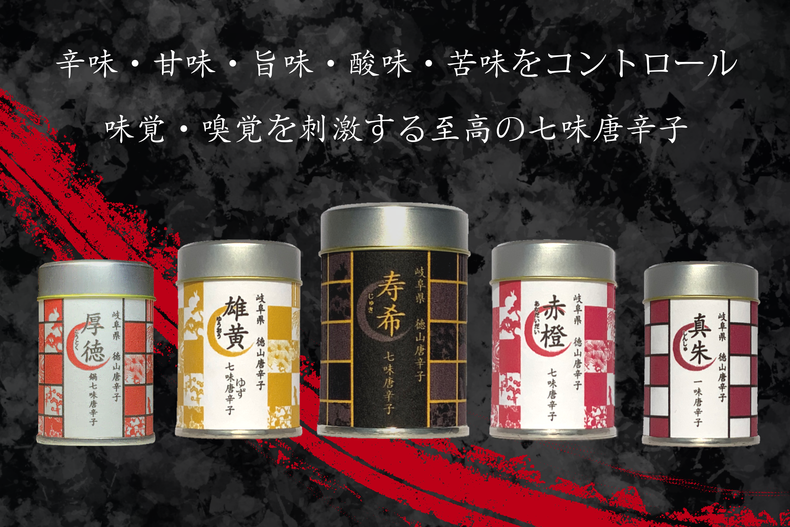 ■贈答用『特選七味唐辛子寿希』は、他に類を見ない香り高い柑橘の香りと旨味、『鍋七味唐辛子厚徳』は山椒・しょうが・徳田ねぎの香りと旨味甘味が広がります。