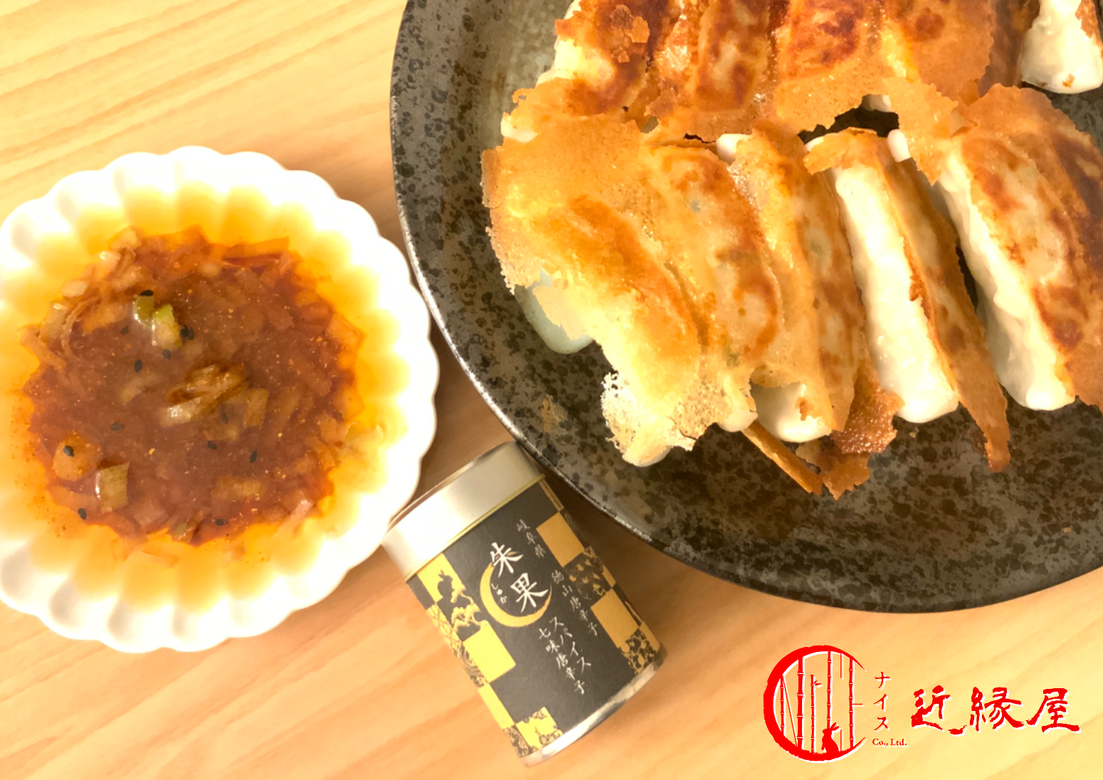 近縁屋【スパイス七味唐辛子朱果】~餃子のタレも味変できるプラスの美味しい時間を~今回は餃子です。醤油・酢・ゴマ油・刻み葱、そして『スパイス七味唐辛子朱果』です。小皿に向かって、スパイス七味唐辛子朱果を振りかけます。スパイスの香辛料が鼻腔を刺激してくれます。ゴマ油との相性もいいので、熱々餃子の肉汁にスパイスが一味、美味しいを足してくれます。ぜひ、いろんな料理に振りかけて、美味しいお食事時間を楽しんでいただきたいです。近縁屋の七味唐辛子は、素材そのまま辛味・旨味・酸味のバランス良い七味唐辛子です。丹精込めて作った七味唐辛子を、ぜひお試しいただければと思います。