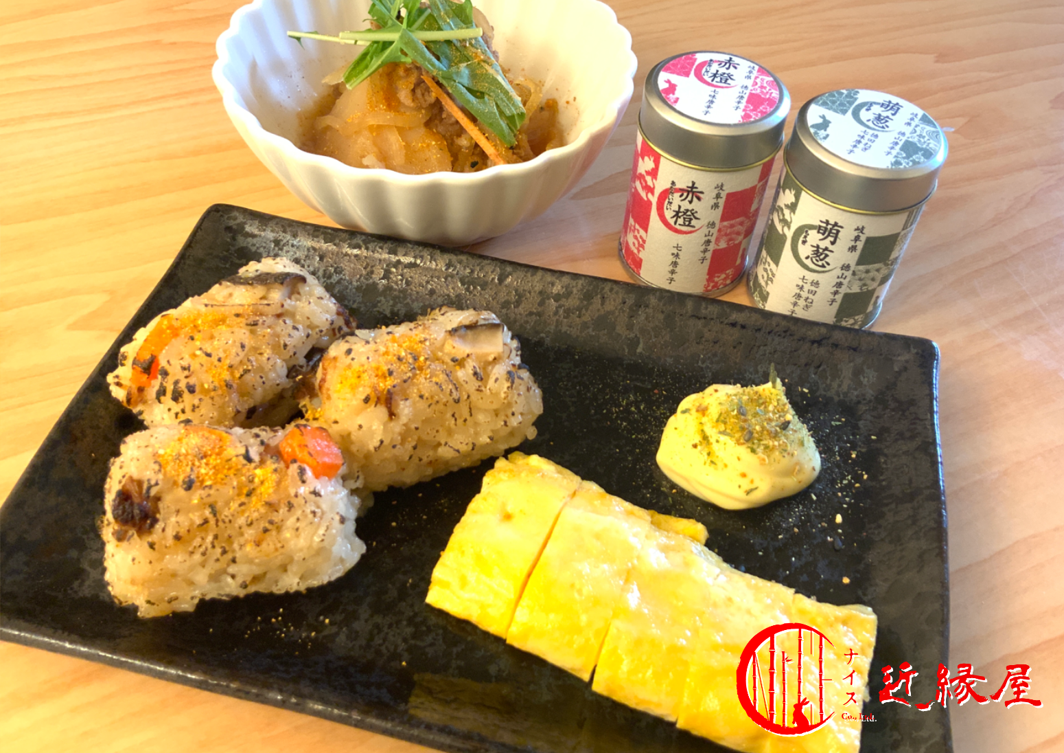 卵焼きに、マヨネーズに『徳田ねぎ七味唐辛子萌葱』を添えてみました!今回は甘目の卵焼きにしたので、甘辛い感じです。おこわ握りと肉じゃがには、『七味唐辛子赤橙』を振りかけました。柑橘系の優しい香と辛さが合って、さらに美味しいです。ちょっとしたことなのですが、簡単ひと手間・振りかけるで、+++(プラス)美味しくなります。卵焼きに、『しょうが七味唐辛子承和』を入れて焼き、お弁当に添えたら、唐辛子としょうがで、体があったまる食材になるな!と気づきました!次回とは言いませんが、近いうちに作ってみますので、楽しみにして頂けると嬉しいです。