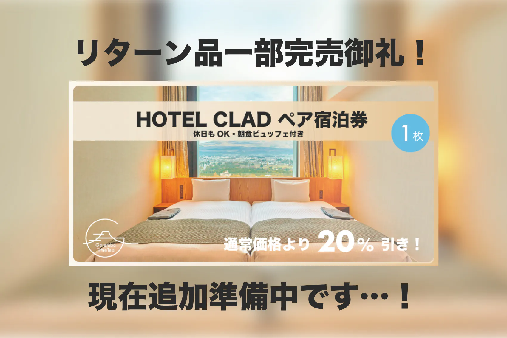 ご好評につき「HOTEL CLAD休日・祝日も使えるペア・朝食付き宿泊券 1枚」が早速完売となりました!皆様の応援のおかげです。心より感謝申し上げます。