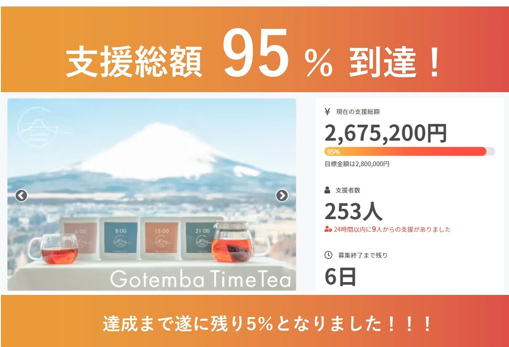 Gotemba Time Teaクラウドファンディングもいよいよ終了まで6日となりました。100%達成もまもなく・・・!ぜひ最後まで応援のほどどうぞよろしくお願いいたします!